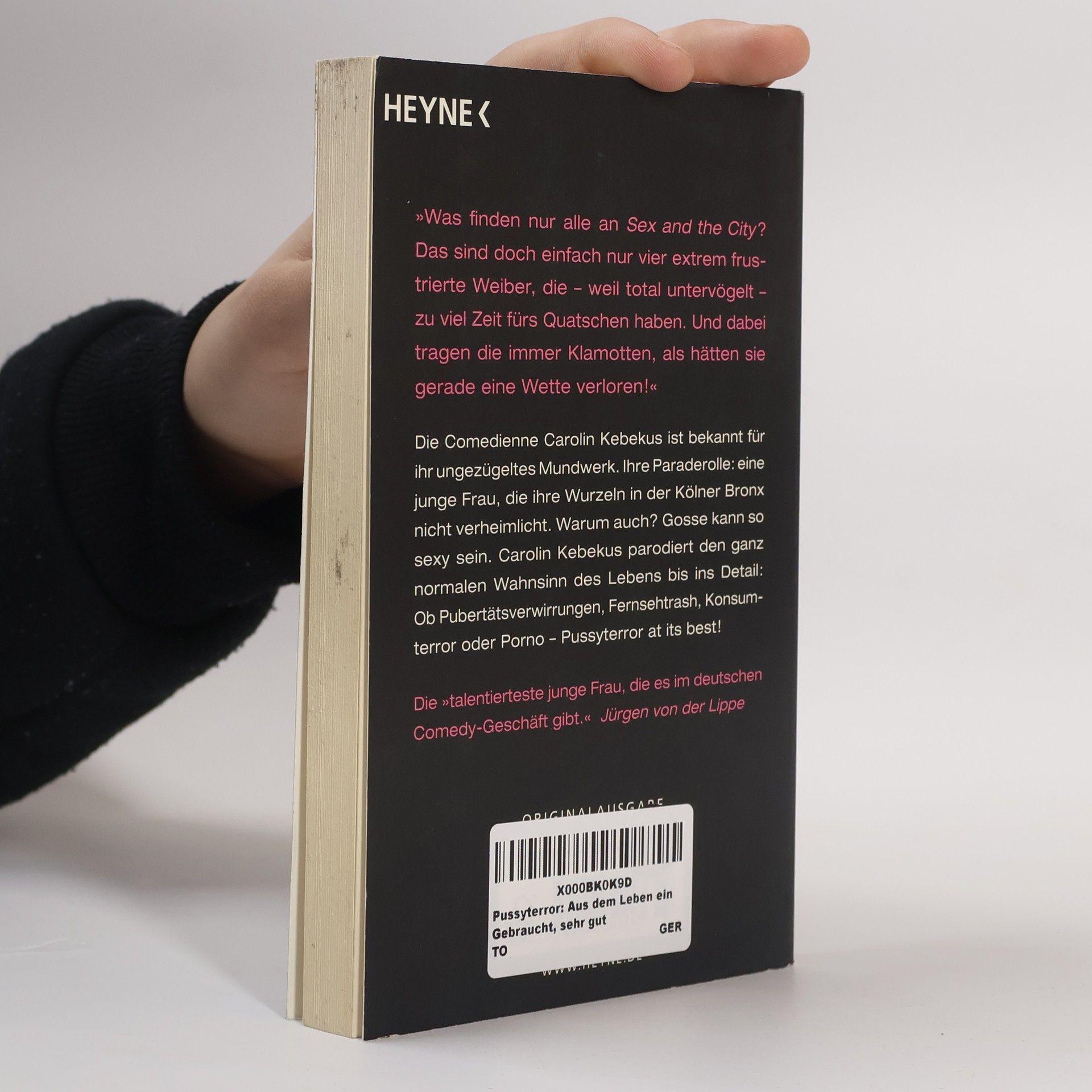 Ob Fernsehen, Bühne oder jetzt in ihrem ersten Buch: Die Ausnahmekünstlerin Carolin Kebekus ist bekannt für ihr ungezügeltes Mundwerk. Ihre Paraderolle: eine junge Frau, die ihre Wurzeln in der Kölner Bronx nicht verheimlicht. Warum auch? Gosse kann so sexy sein. Die Comedienne parodiert den ganz normalen Wahnsinn des Lebens bis ins Detail: Ob Pubertätsverwirrungen, Fernsehtrash, Konsumterror oder Porno – unerbittlich konfrontiert sie uns mit den Stereotypen der Geschlechterrollen und spielt mit der ganzen Breite des Ausdrucks: von Mädchen-Charme über Pöbeljargon bis zum Tabubruch – Pussyterror at its best!