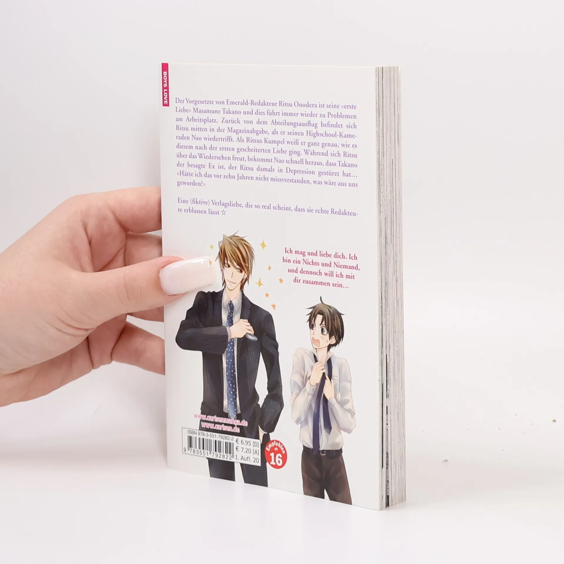 Es gibt wohl keinen „Boys-Love“-Fan, der nicht schon mal eins der Werke von Shungiku Nakamura gelesen hat: prägt sie doch seit mittlerweile über einem Jahrzehnt weltweit maßgeblich die Verlagsszene! Der Vorgesetzte von Emerald-Redakteur Ritsu Onodera ist seine »erste Liebe« Masamune Takano und dies führt immer wieder zu Problemen am Arbeitsplatz. Zurück von dem Abteilungsausflug befindet sich Ritsu mitten in der Magazinabgabe, als er seinen Highschool-Kameraden Nao wiedertrifft. Als Ritsus Kumpel weiß er ganz genau, wie es diesem nach der ersten gescheiterten Liebe ging. Während sich Ritsu über das Wiedersehen freut, bekommt Nao schnell heraus, dass Takano der besagte Ex ist, der Ritsu damals in Depression gestürzt hat… »Hätte ich das vor zehn Jahren nicht missverstanden, was wäre aus uns geworden?« Eine (fiktive) Verlagsliebe, die so real scheint, dass sie echte Redakteure erblassen lässt ✩ Eine prickelnde Liebesgeschichte zwischen zwei Kollegen, die die Vergangenheit zwischen sich einfach nicht ruhen lassen können... Weitere Informationen: - Für Fans von JUNJO ROMANTICA - empfohlen ab 16 Jahren - Die Vorlage zur Anime-Adaption auf Crunchyroll