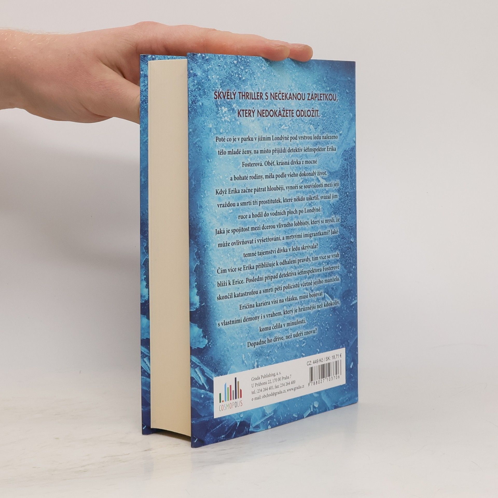 Poté co je v parku v jižním Londýně pod vrstvou ledu nalezeno tělo mladé ženy, na místo přijíždí detektiv šéfinspektor Erika Fosterová. Oběť, krásná dívka z mocné a bohaté rodiny, měla podle všeho dokonalý život. Když Erika začne pátrat hlouběji, vynoří se souvislosti mezi její vraždou a smrtí tří prostitutek, které někdo uškrtil, svázal jim ruce a hodil do vodních ploch po Londýně. Jaká je spojitost mezi dcerou vlivného lobbisty, který si myslí, že může ovlivňovat i vyšetřování, a mrtvými imigrantkami? Jaké temné tajemství dívka v ledu skrývala? Čím více se Erika přibližuje k odhalení pravdy, tím více se vrah blíží k Erice. Poslední případ detektiva šéfinspektora Fosterové skončil katastrofou a smrtí pěti policistů včetně jejího manžela. Eričina kariéra visí na vlásku, musí bojovat s vlastními démony i s vrahem, který je hrůznější než kdokoliv, komu čelila v minulosti. Dopadne ho dříve, než udeří znovu?