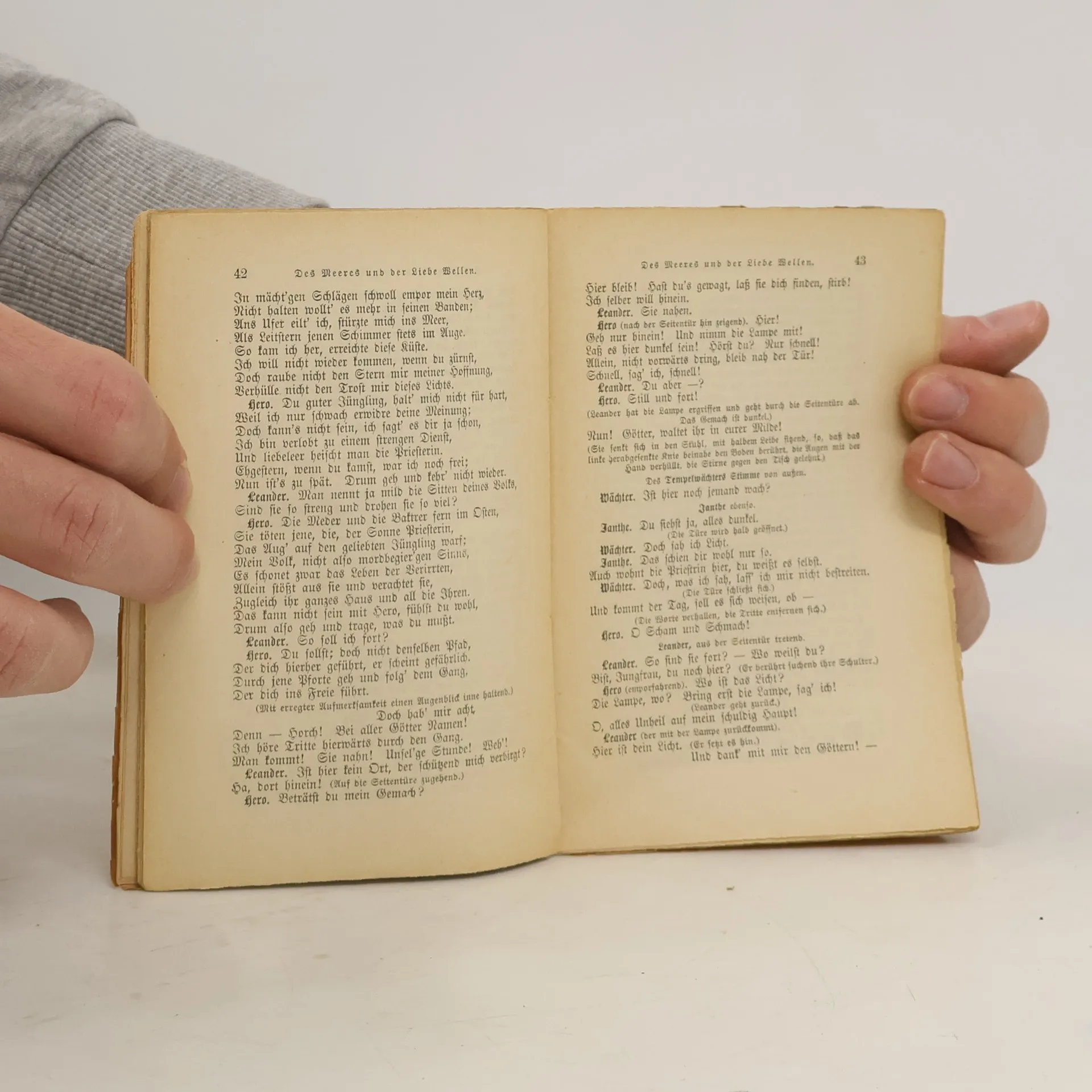 In Grillparzers Trauerspiel um Hero, die sich als Priesterin der Aphrodite geweiht hat, und Leander, den melancholischen Jüngling, befehden sich Liebeszuneigung und starre Satzung, biedermeierliche Kleinbürgermentalität und der Anspruch, das menschlich Richtige frei, ohne Einschränkung und ohne Zwang zu tun, einzig deshalb, wie Hero es ausdrückt, »weil ich es so erkannt«.