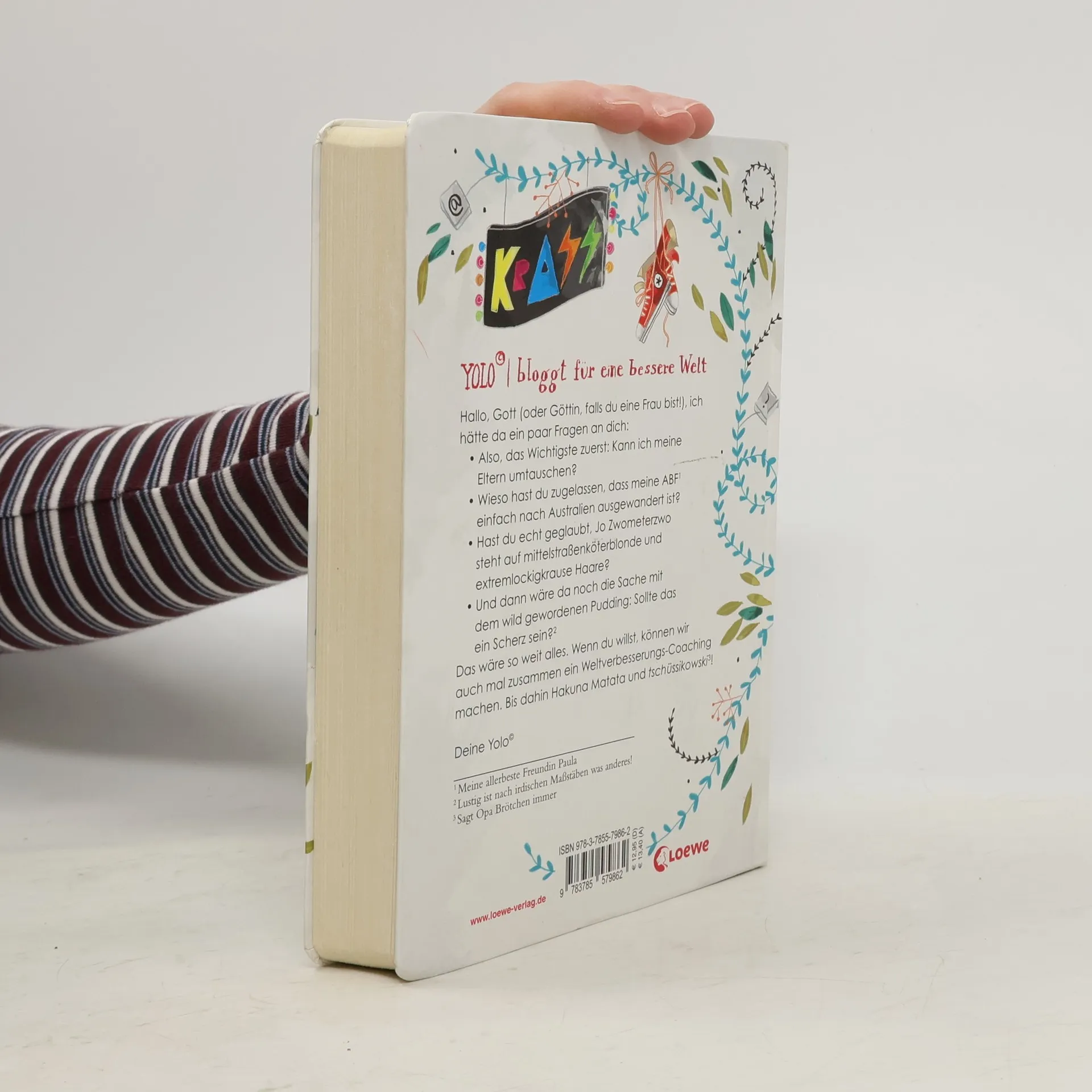 Yolo ist dreizehndreiviertel, einzige Tochter von geschiedenen Ernährungsberatern und mit der Gesamtsituation unzufrieden. Vor allem Erwachsenen fehlt einfach der Blick für das Wesentliche. Dabei ist doch völlig klar, dass Nuss-Nugat-Schokolade und Partys im KRASS zu den Grundrechten von Teenagern gehören! Yolo bloggt, um die Welt ein bisschen besser zu machen. Und zu einer besseren Welt gehört für Yolo auch, endlich von Jo Zwometerzwo beachtet zu werden – nur wie soll sie das am besten anstellen? Weltverbesserung aus der Sicht eines Teenagers: Ein frech und authentisch erzähltes Mädchenbuch mit witzigen Illustrationen zum Thema Bloggen, Freundschaft und erste Liebe.