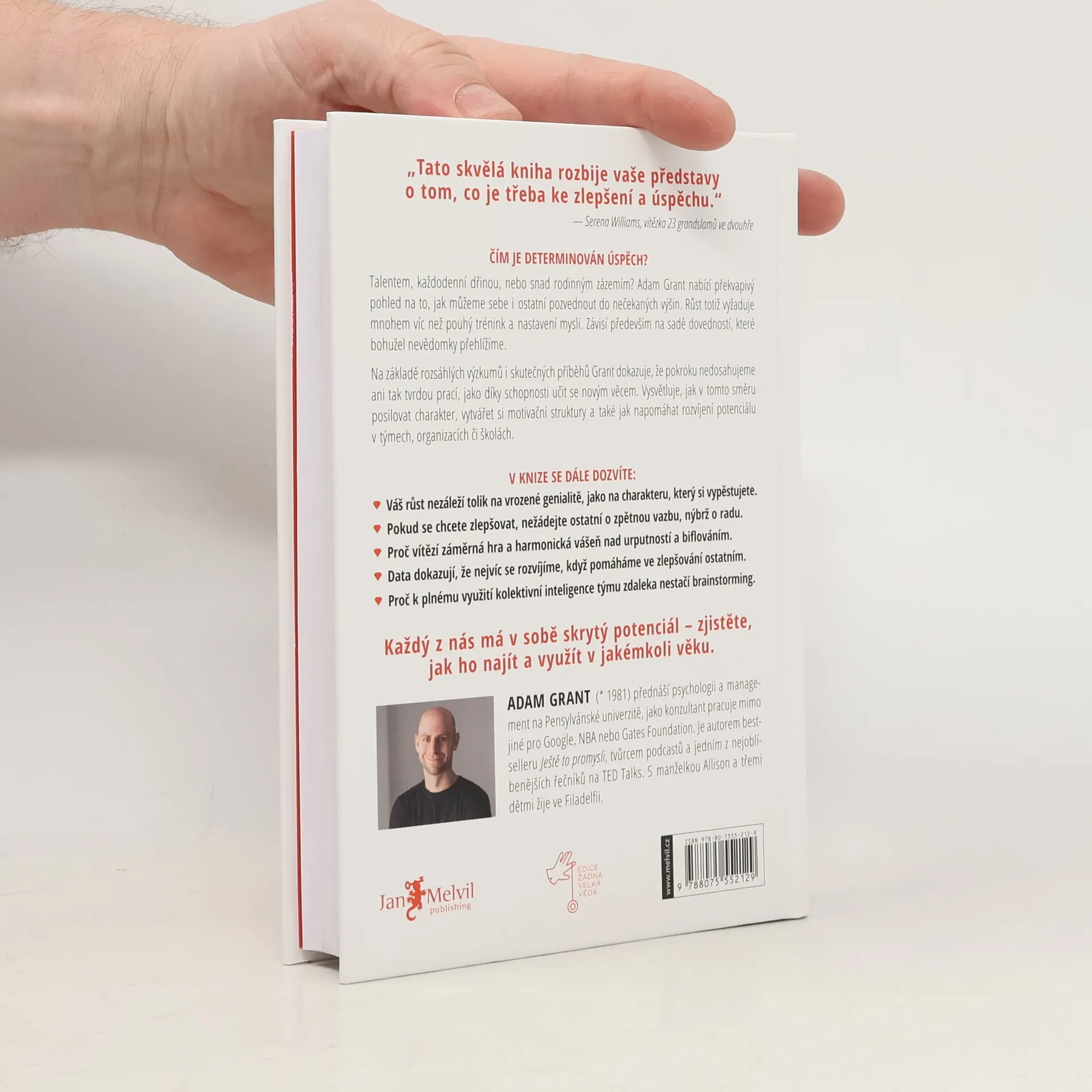 Čím myslíte, že je determinován úspěch? Je to talent, tvrdá dřina či snad dobré rodinné zázemí? Autor bestselleru Ještě to promysli vám ve své novince představí novou perspektivu toho, jak můžeme sebe i ostatní pozvednout do nečekaných výšin. Žijeme ve světě, který je posedlý talenty. Oslavujeme nadané studenty ve škole, ve sportu, zázračné děti v hudbě. Toto obdivování vrozených výhod nás ale vede k přehlížení vlastního potenciálu, podceňování rozsahu dovedností, jež se můžeme během života naučit, a cílů, kterých můžeme dosáhnout. A to může být chyba! Každý v sobě máme více potenciálu ke zlepšení, než co si myslíme. A vůbec nevadí, když u nás příležitost zrovna neklepe. Vždy existují způsoby, jak jí postavit dveře.