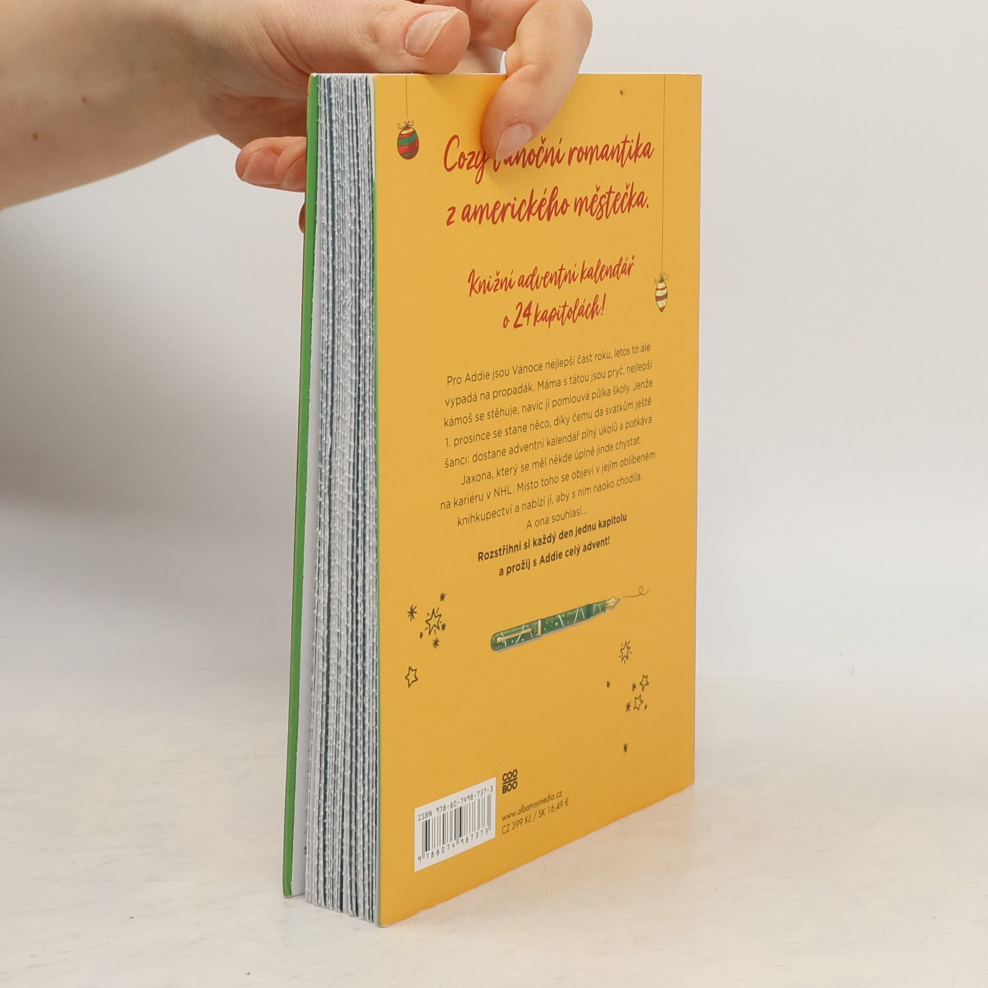 Cozy vánoční romantika z amerického městečka. Knižní adventní kalendář o 24 kapitolách! Pro Addie jsou Vánoce nejlepší část roku, letos to ale vypadá na propadák. Máma s tátou jsou pryč, nejlepší kámoš se stěhuje, navíc ji pomlouvá půlka školy. Jenže 1. prosince se stane něco, díky čemu dá svátkům ještě šanci: dostane adventní kalendář plný úkolů a potkává Jaxona, který se měl úplně jinde chystat na kariéru v NHL. Místo toho se objeví v jejím oblíbeném knihkupectví a nabízí jí, aby s ním naoko chodila. A ona souhlasí… Rozstřihni si každý den kapitolu a prožij s Addie celý advent!