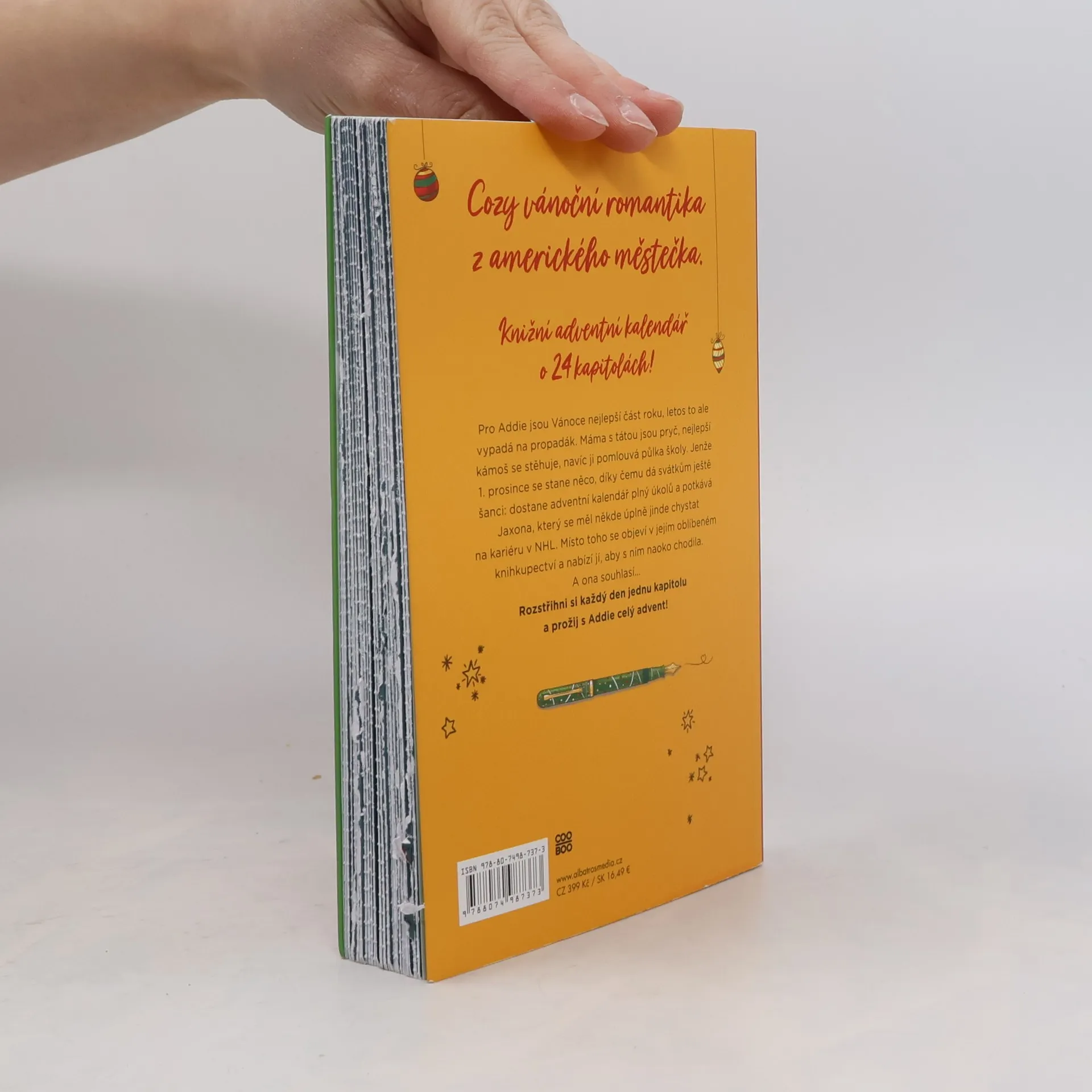 Cozy vánoční romantika z amerického městečka. Knižní adventní kalendář o 24 kapitolách! Pro Addie jsou Vánoce nejlepší část roku, letos to ale vypadá na propadák. Máma s tátou jsou pryč, nejlepší kámoš se stěhuje, navíc ji pomlouvá půlka školy. Jenže 1. prosince se stane něco, díky čemu dá svátkům ještě šanci: dostane adventní kalendář plný úkolů a potkává Jaxona, který se měl úplně jinde chystat na kariéru v NHL. Místo toho se objeví v jejím oblíbeném knihkupectví a nabízí jí, aby s ním naoko chodila. A ona souhlasí… Rozstřihni si každý den kapitolu a prožij s Addie celý advent!