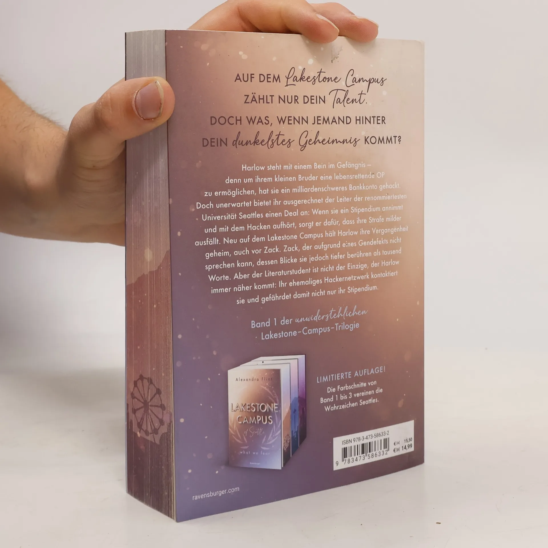 ***Limitierte Auflage mit farbigem Buchschnitt und Charakterkarte! Nur solange der Vorrat reicht!*** Harlow steht mit einem Bein im Gefängnis – denn um ihrem kleinen Bruder eine lebensrettende OP zu ermöglichen, hat sie ein milliardenschweres Bankkonto gehackt. Doch unerwartet bietet ihr der Leiter des Lakestone Campus in Seattle ein Stipendium und Sozialstunden an. Neu an der Uni hält Harlow ihre Vergangenheit geheim. Auch vor dem Literaturstudenten Zack, der aufgrund eines Gendefekts nicht sprechen kann. Aber nicht nur er kommt Harlow immer näher, sondern auch ihr ehemaliges Hackernetzwerk. Mitreißend. Knisternd. Unwiderstehlich. Band 1 der neuen New-Adult-Trilogie von SPIEGEL-Bestsellerautorin Alexandra Flint. Die Bücher der Lakestone-Campus-Reihe: Band 1: What We Fear Band 2: What We Lost (erscheint im Herbst 2024) Band 3: What We Hide (erscheint im Frühjahr 2025) Weitere knisternde New-Adult-Romance der Autorin bei Ravensburger: Maple-Creek-Dilogie Band 1: Meet Me in Maple Creek Band 2: Save Me in Maple Creek