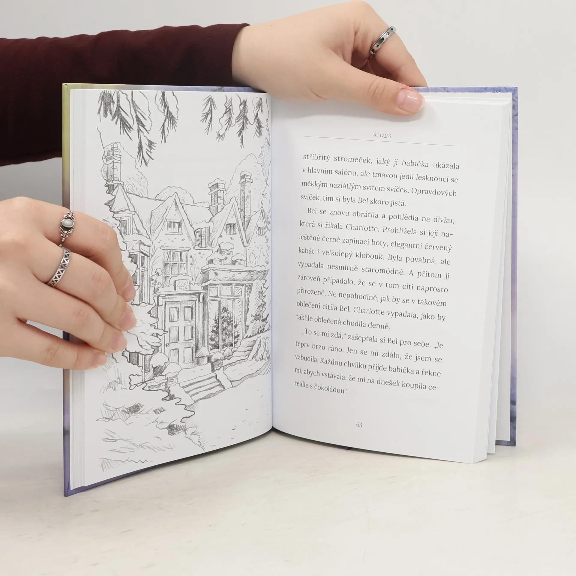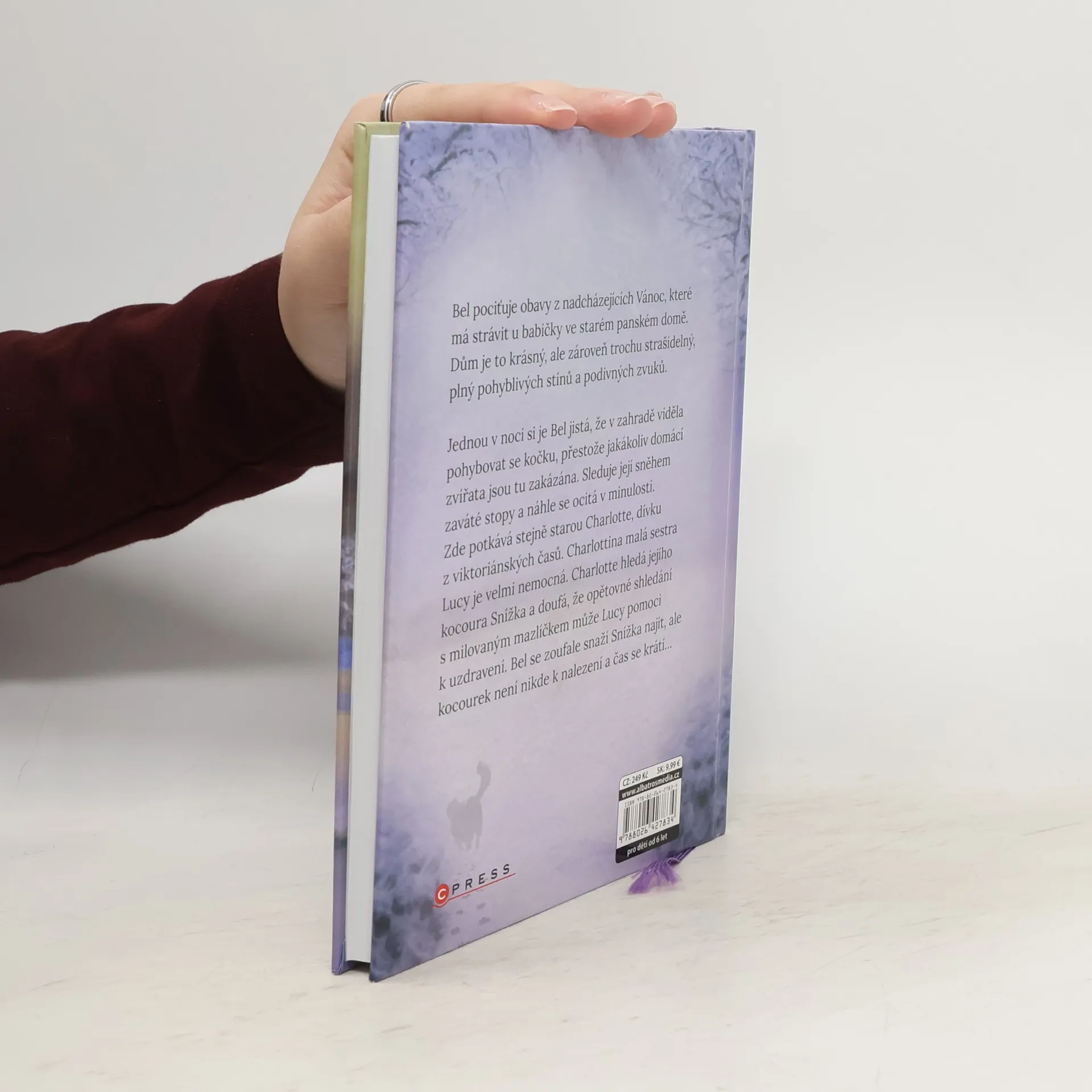 Vánoční příběh, který zahřeje, od světové autorky oblíbené i u nás. Bel pociťuje obavy z Vánoc, které má strávit u babičky ve starém domě. Dům je to krásný, ale zároveň trochu strašidelný. Jednou Bel v zahradě spatří kočku. Sleduje její stopy a náhle se ocitá v minulosti. Zde potkává stejně starou Charlotte, dívku z viktoriánských časů. Charlottina malá sestra Lucy je velmi nemocná. Charlotte hledá jejího kocoura Snížka a doufá, že opětovné shledání s milovaným mazlíčkem může Lucy pomoci k uzdravení. Ale kocourek není nikde k nalezení a čas se krátí…