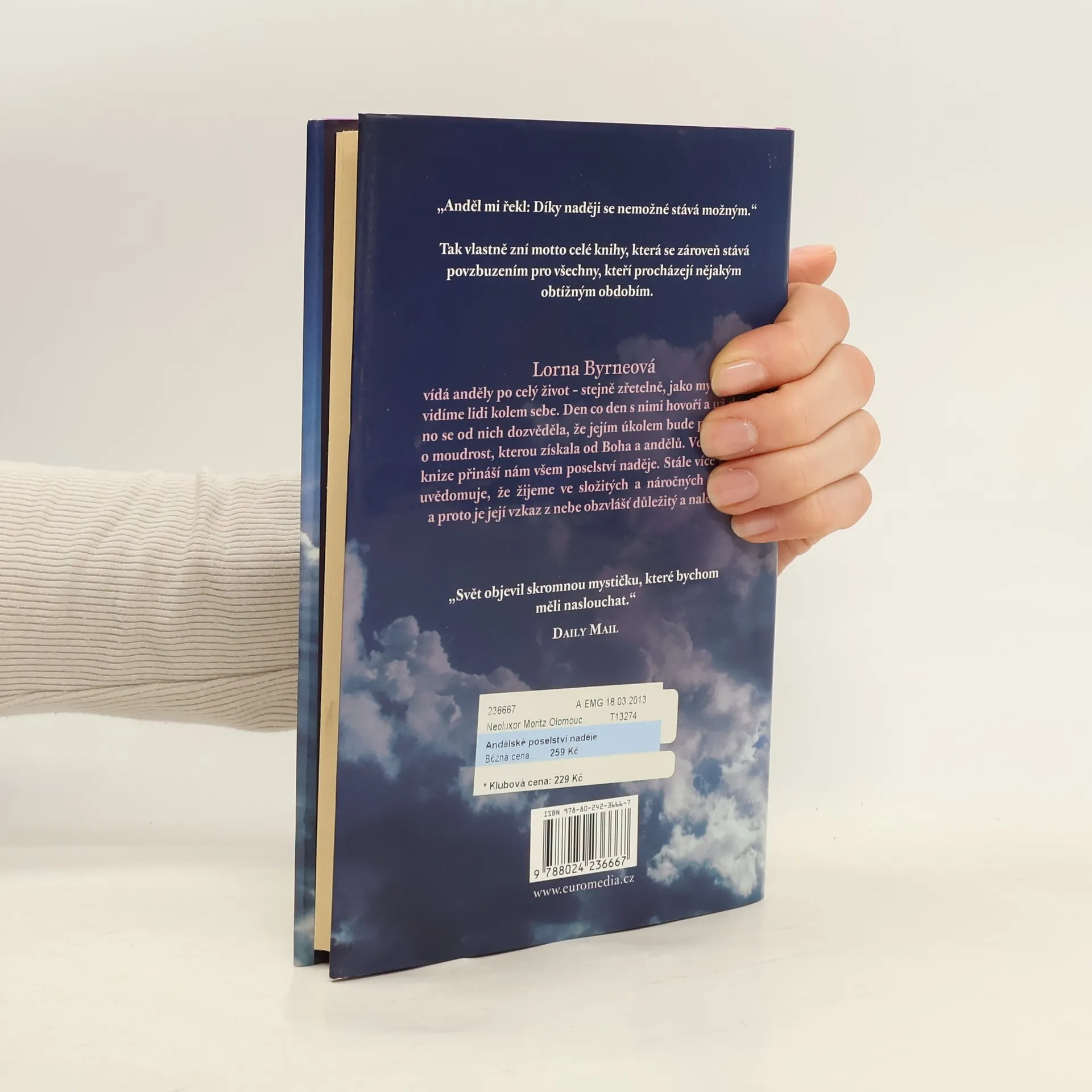 Irská autorka Lorna Byrne, která má od nejútlejšího dětství výjimečnou schopnost vidět anděly a komunikovat s nimi, je českým čtenářům dobře známá. Nesmírnou popularitu si získala jak její autobiografická kniha Andělé v mých vlasech, tak i volné pokračování pod názvem Schody do nebe. Ve svém nejnovějším třetím díle Andělské poselství naděje se autorka obrací přímo ke čtenářům s doporučeními, jak mohou oslovit anděly s prosbou o pomoc. Zdůrazňuje velkou sílu nejen modlitby a lásky, ale především naděje.