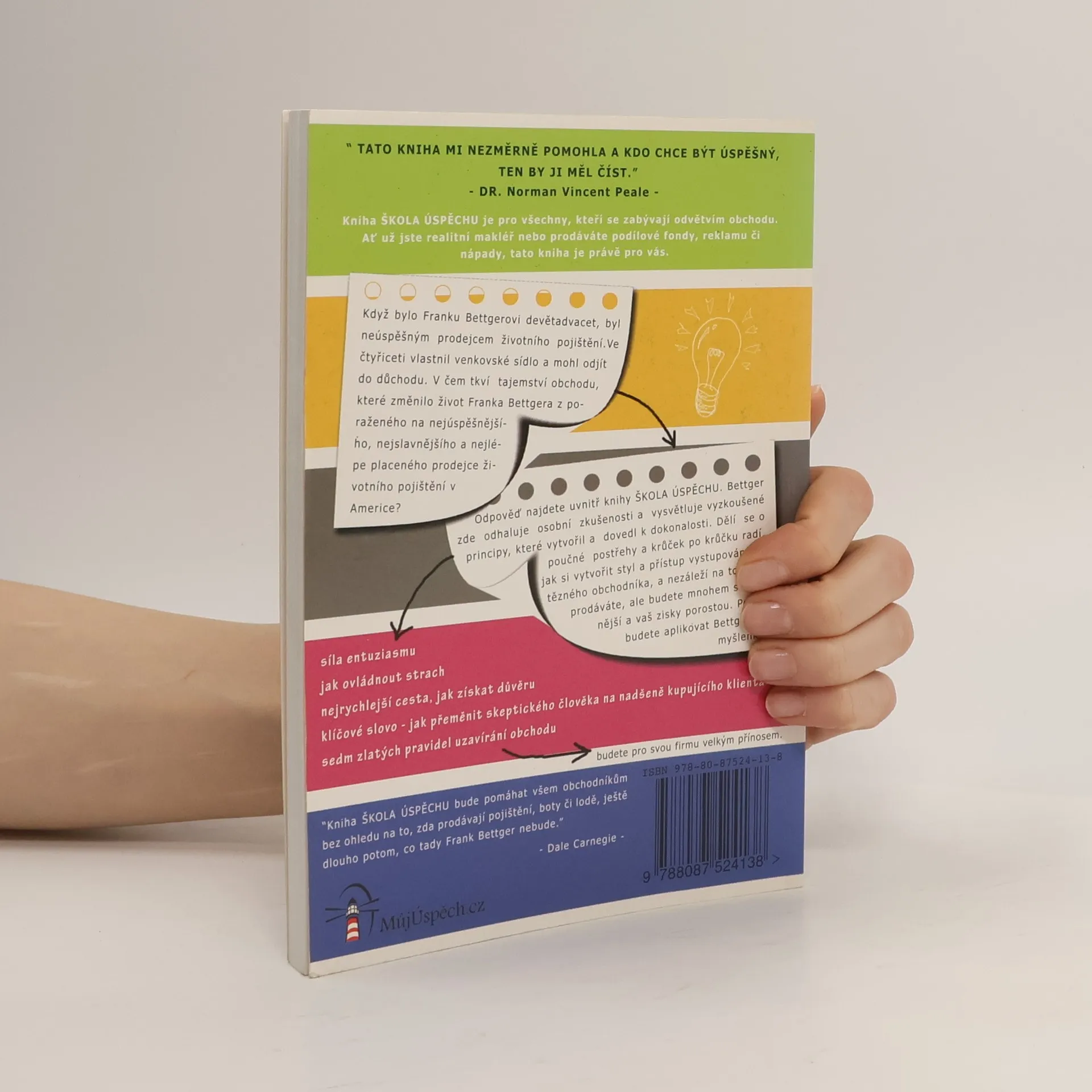 Kniha Škola úspěchu - JAK JSEM SVŮJ NEÚSPĚCH V PRODEJI OBRÁTIL NA ÚSPĚCH je pro všechny,kteří se zabývají odvětvím obchodu. Ať už jste realitní makléř nebo prodáváte podílové fondy, reklamu či nápady - tato kniha je právě pro vás. Když bylo Franku Bettgerovi devětadvacet, byl neúspěšným prodejcem životního pojištění. Ve čtyřiceti vlastnil venkovské sídlo a mohl odejít do důchodu. Dozvíte se v čem tkví tajemství obchodu, které změnilo život Franka Bettgera z poraženého na nejúspěšnějšího, nejslavnějšího a nejlépe placeného prodejce životního pojištění v Americe.Bettger v knize odhaluje osobní zkušenosti a vysvětluje vyzkoušené principy, které vytvořil a dovedl k dokonalosti. Dělí se o poučné postřehy a krůček po krůčku radí, jak si vytvořit styl, přístup a vystupování vítězného obchodníka. Nezáleží na tom, co prodáváte, ale budete mnohem schopnější a vaše zisky porostou.
