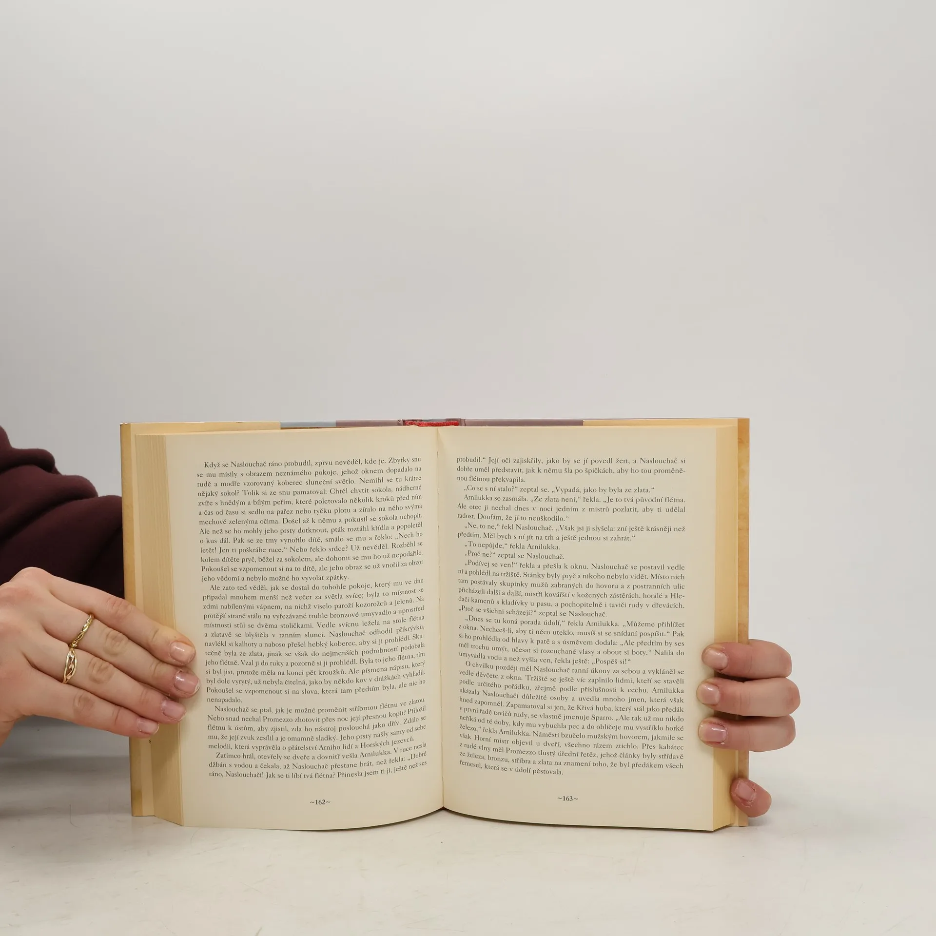 V prvním díle pohádkové trilogie se začal odvíjet příběh Naslouchače, tichého chlapce, který při své podivuhodné cestě dokázal spolu se svým společníkem, němým Barlem, osvobodit kraj Barleboogu od krutovlády krásné Gizy a jejích šedých vlků. Setkal se přitom nejen se svým dědečkem, proslulým Jemným Flétnistou, ale také se slavným Arnim, který mu před svou smrtí svěřil tajuplný kámen. V dalším pokračování Naslouchačovy dobrodružné pouti mu dědeček daruje svou kouzelnou flétnu, jež má podivuhodnou moc a dokáže magicky působit na ty, kdo její hře naslouchají. Po návštěvě v rodném Fraglundu se Naslouchač vydává k Arniho lidem. Doufá, že jako Nositel kamene u nich bude přívětivě přivítán. Učaruje mu půvabná zelenooká dívka Narcia, dcera Arniho zástupce Höniho a Sokolí ženy. Aby však získal její ruku a srdce, musí podniknout tři odvážné cesty, mimo jiné navštívit nebezpečné Kořistníky, které předtím svou hrou na flétnu rozhněval… Překlad Radovan Charvát.