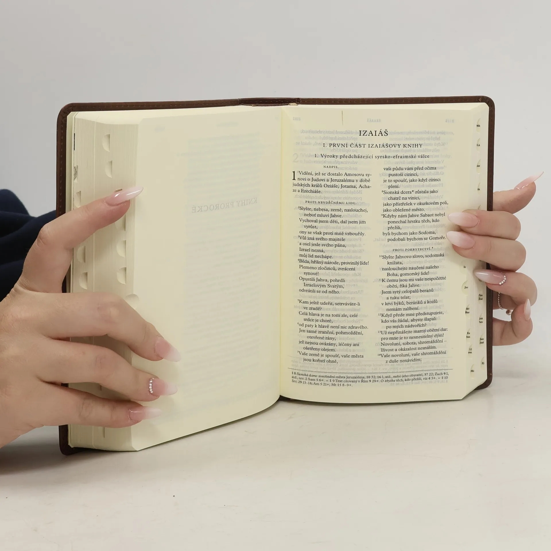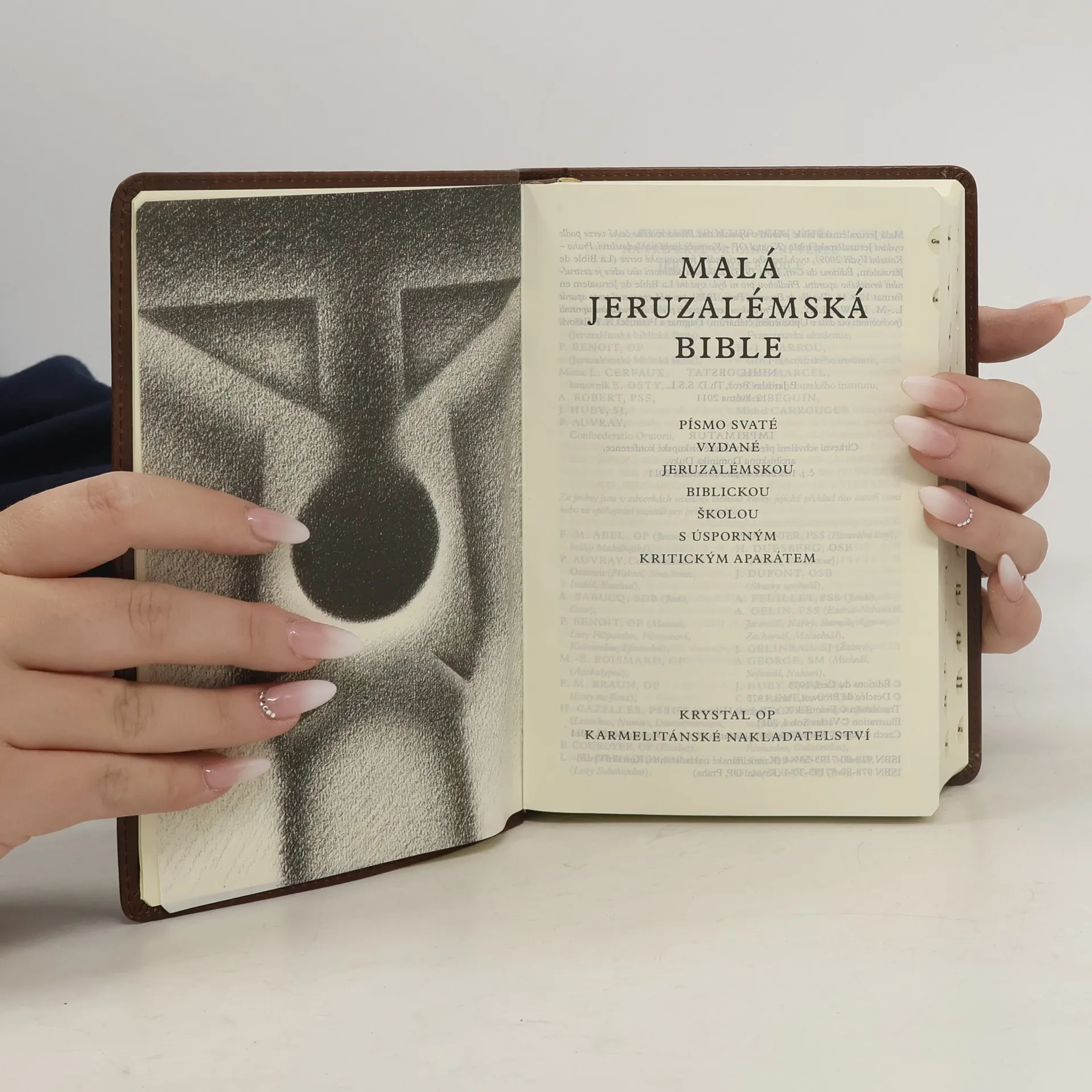 Malá Jeruzalémská bible - písmo svaté vydané Jeruzalémskou biblickou školou s úsporným kritickým aparátem. Imitace hnědé kůže s plastickou ražbou, měkká vazba, 1952 stran formátu 120 x 180 mm.