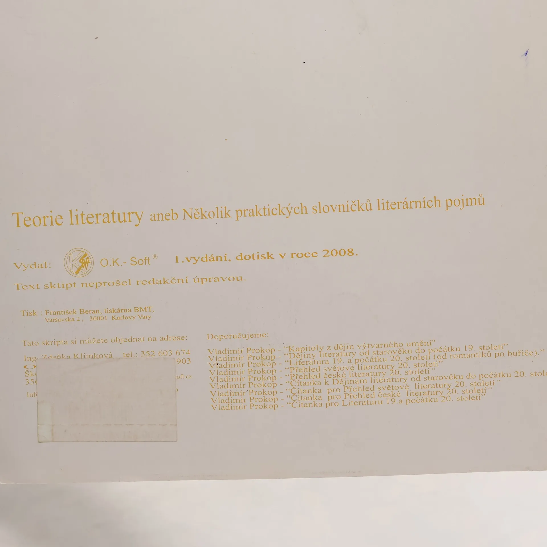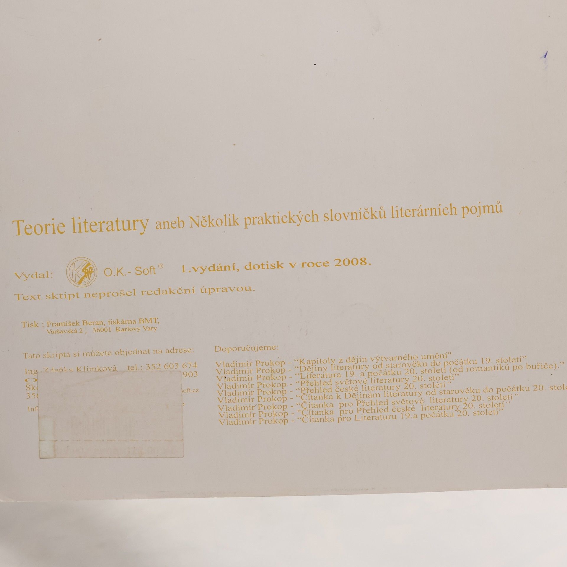 Stejně jako u předchozích titulů je i tentokrát autorem středoškolský učitel. Tato jedinečně koncipovaná skripta teorie literatury završuje cyklus publikací pro výuku na středních školách od Vladimíra Prokopa. Slovníčky umožňují rychlé a racionální studium nejen jednotlivých pojmů,ale rovněž celých tématických oblastí. Ocení studenti všech věkových kategorií - právě v tomto smyslu skripta zaplňují mezeru ve výuce literatury.