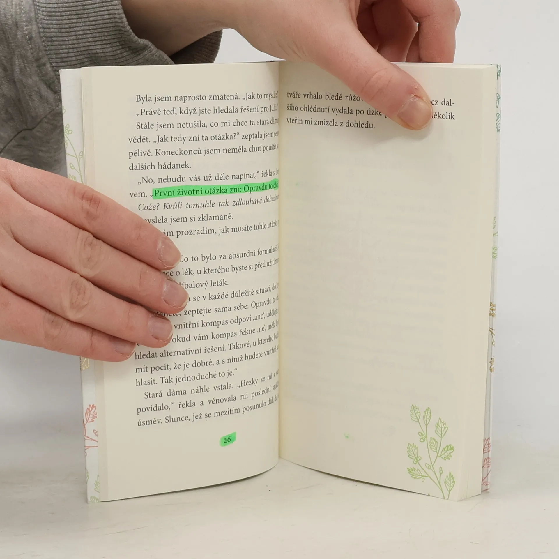 Tato kniha vám může změnit život. Její život je zdánlivě dokonalý, má všechno, po čem vždycky toužila, ale mladá matka dvou dětí se cítí unavená a vyhořelá. Neví, jak zvládat každodenní balancování mezi prací a rodinou, není šťastná a přemýšlí, proč tomu tak je. Když se jednou prochází lesem a přemýšlí o svém životě, potká starou dámu. Ta jí poví o „čtyřech životních otázkách“, které mají moc změnit všechno k lepšímu. Vystresovaná mladá žena je k nim nejprve skeptická, ale postupně si je začne pokládat a uvědomí si, jak se její život během krátké doby zlepšil. Čím více se odvažuje experimentovat, tím vícero dveří se jí otevírá. Je však připravená položit si i poslední otázku?