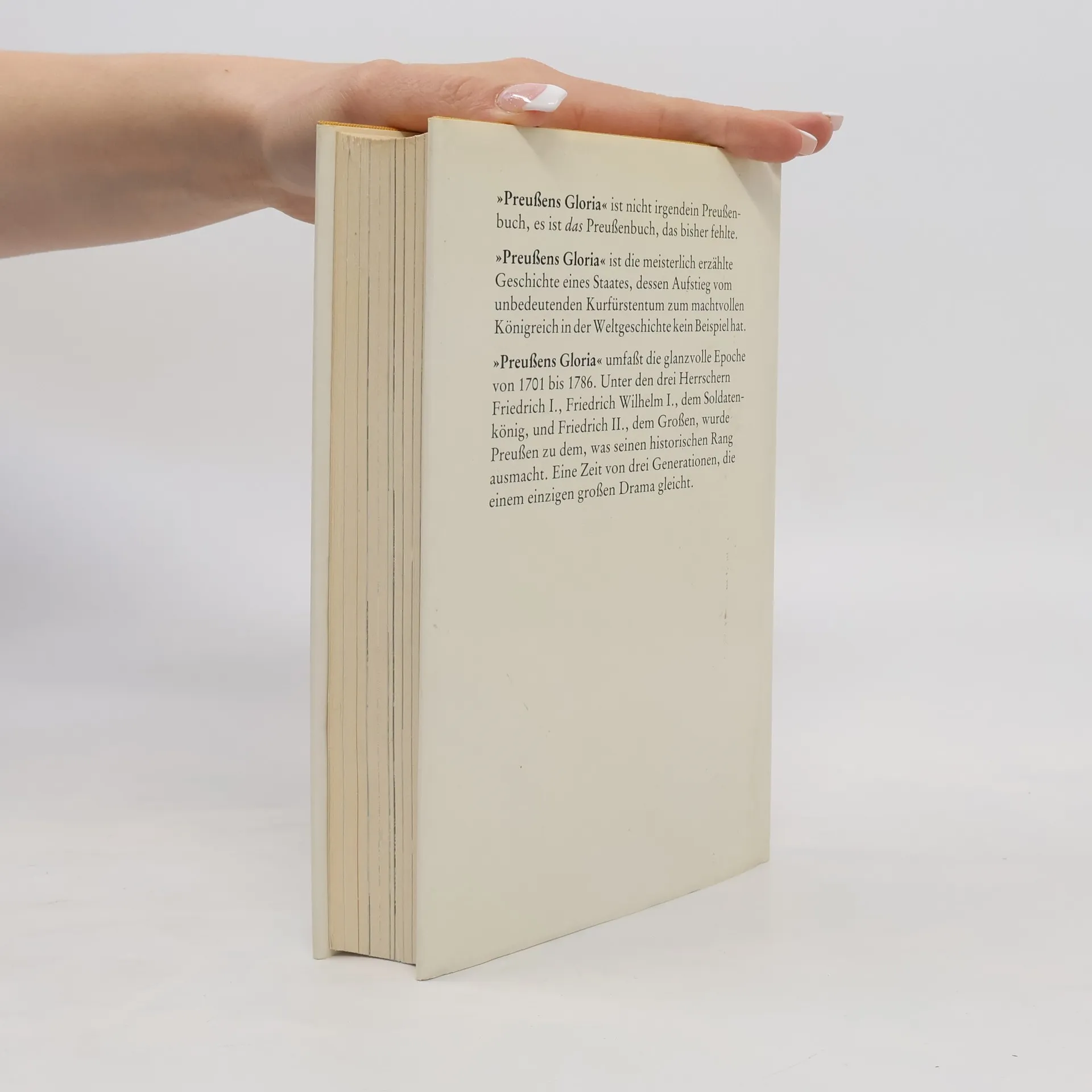 Preußens Gloria ist die meisterhaft erzählte Geschichte eines Staates, dessen Aufstieg vom unbedeutenden Kurfürstentum zum machtvollen Königreich in der Weltgeschichte kein Beispiel hat. Sein Ethos und seine Lebensform überdauerten die Jahrhunderte, wie auch seine Tugenden vorbildlich blieben: die Toleranz und die Ordnung, die Tapferkeit und die Gottesfurcht, der Fleiß und die Unbestechlichkeit, das Mehr-sein-als-scheinen. In drei glanzvollen Epochen von 1701 bis 1786 wurde Preußen zu dem, was seinen historischen Rang ausmacht. Eine Zeit von drei Generationen, die einem einzigen großen Drama gleicht.