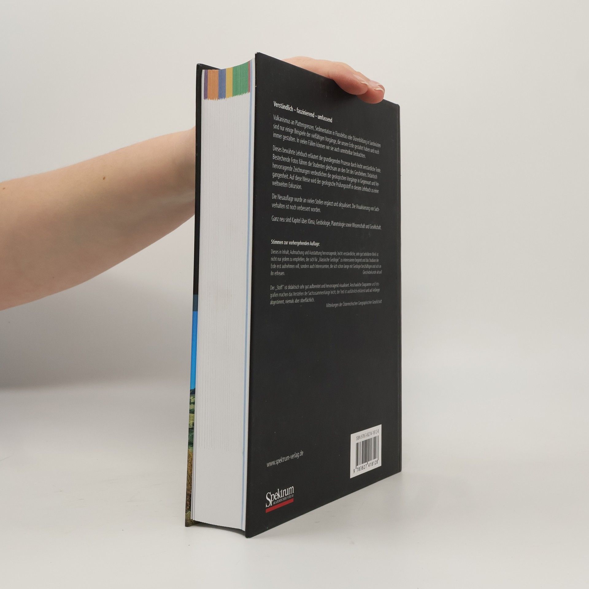 Vulkanismus an Plattengrenzen, Sedimentation in Flussdeltas oder Dünenbildung in Sandwüsten sind nur einige Beispiele der vielfältigen Vorgänge, die unsere Erde gestaltet haben und noch immer gestalten. In vielen Fällen können wir sie auch unmittelbar beobachten. Dieses bewährte Lehrbuch erläutert die grundlegenden Prozesse durch leicht verständliche Texte. Bestechende Fotos führen die Studenten gleichsam an den Ort des Geschehens. Didaktisch hervorragende Zeichnungen verdeutlichen die geologischen Vorgänge in Gegenwart und Vergangenheit. Auf diese Weise wird der geologische Prüfungsstoff in diesem Lehrbuch zu einer weltweiten Exkursion. Die Neuauflage wurde an vielen Stellen ergänzt und verbessert. Die Visualisierung von Sachverhalten ist noch verbessert worden. Ganz neu sind Kapitel über Klima, Geobiologie, Planetologie sowie Wissenschaft und Gesellschaft.
