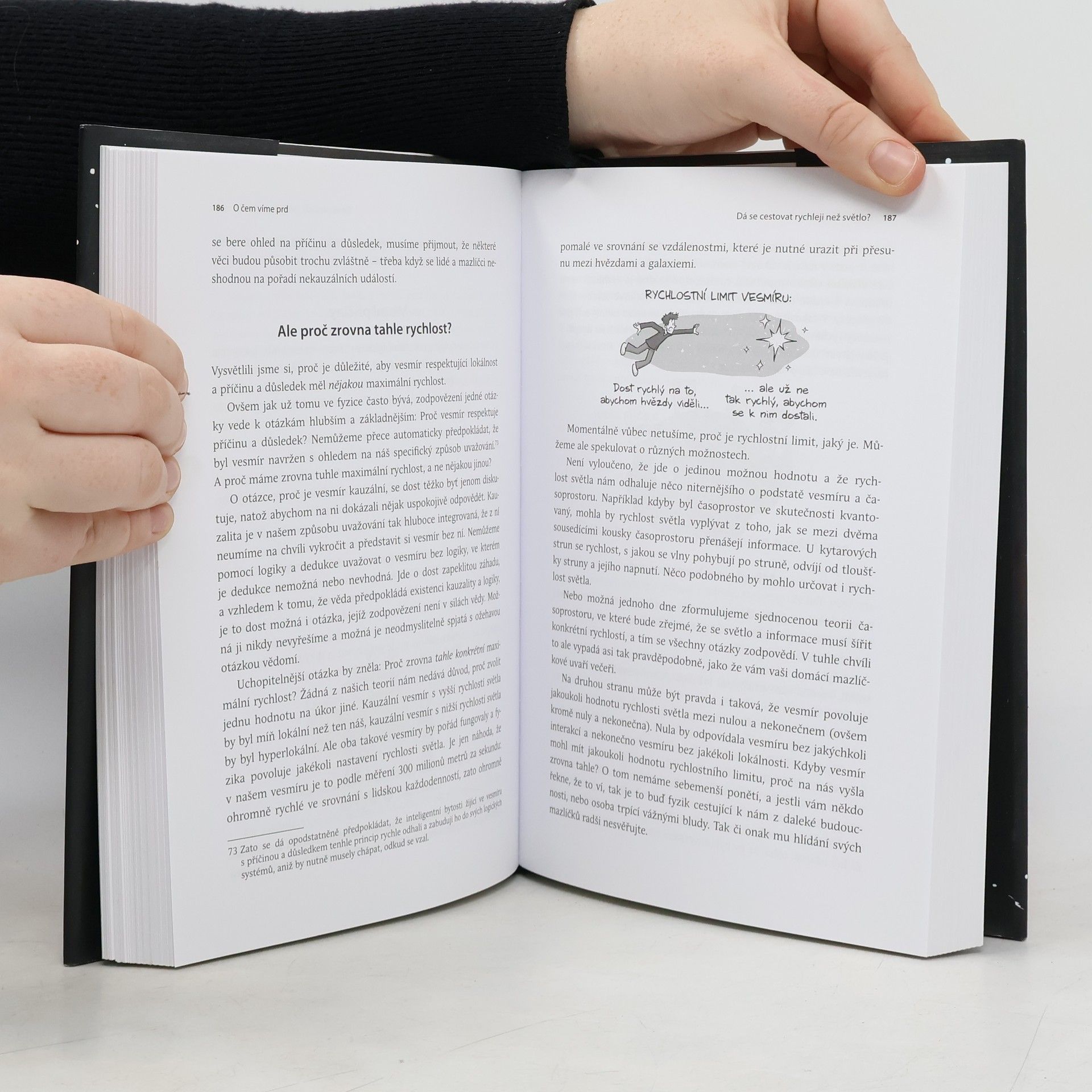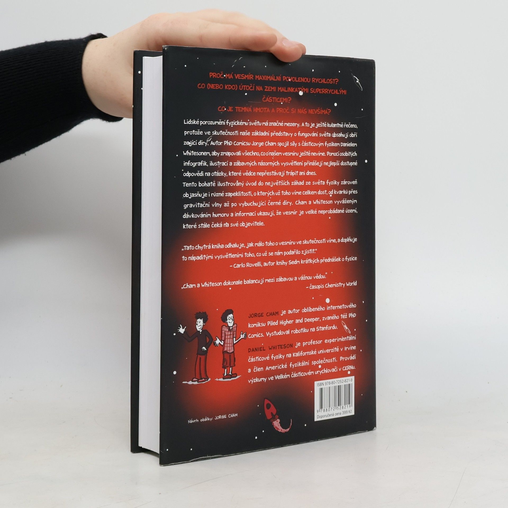 Proč má vesmír maximální povolenou rychlost? Co (nebo kdo) útočí na zemi malinkatými superrychlými částicemi? Co je temná hmota a proč si nás nevšímá? Lidské porozumění fyzickému světu má značné mezery. A to je ještě kulantně řečeno, protože ve skutečnosti naše základní představy o fungování světa obsahují obří zející díry. Autor PhD Comicsu Jorge Cham spojil síly s částicovým fyzikem Danielem Whitesonem, aby zmapovali všechno, co o našem vesmíru ještě nevíme. Pomocí osobitých infografik, ilustrací a zábavných názorných vysvětlení přinášejí nejlepší dostupné odpovědi na otázky, které vědce nepřestávají trápit ani dnes. Tento bohatě ilustrovaný úvod do největších záhad ze světa fyziky zároveň objasňuje i různé zapeklitosti, o kterých už toho víme celkem dost, od kvarků přes gravitační vlny až po vybuchující černé díry. Cham a Whiteson vyváženým dávkováním humoru a informací ukazují, že vesmír je velké neprobádané území, které stále čeká na své objevitele. „Tato chytrá kniha odhaluje, jak málo toho o vesmíru ve skutečnosti víme, a doplňuje to nápaditými vysvětleními toho, co už se nám podařilo zjistit.“ Carlo Rovelli, autor knihy Sedm krátkých přednášek o fyzice