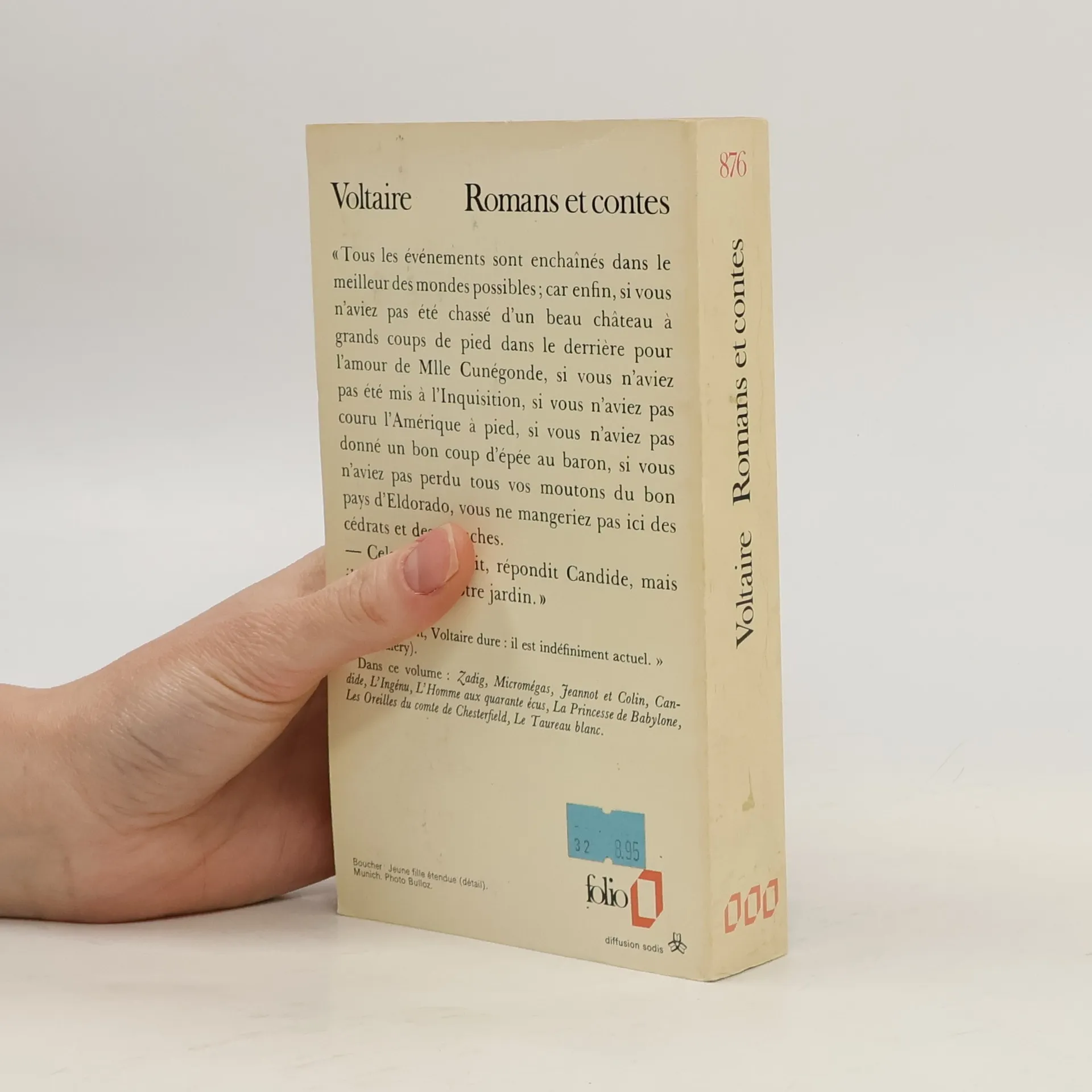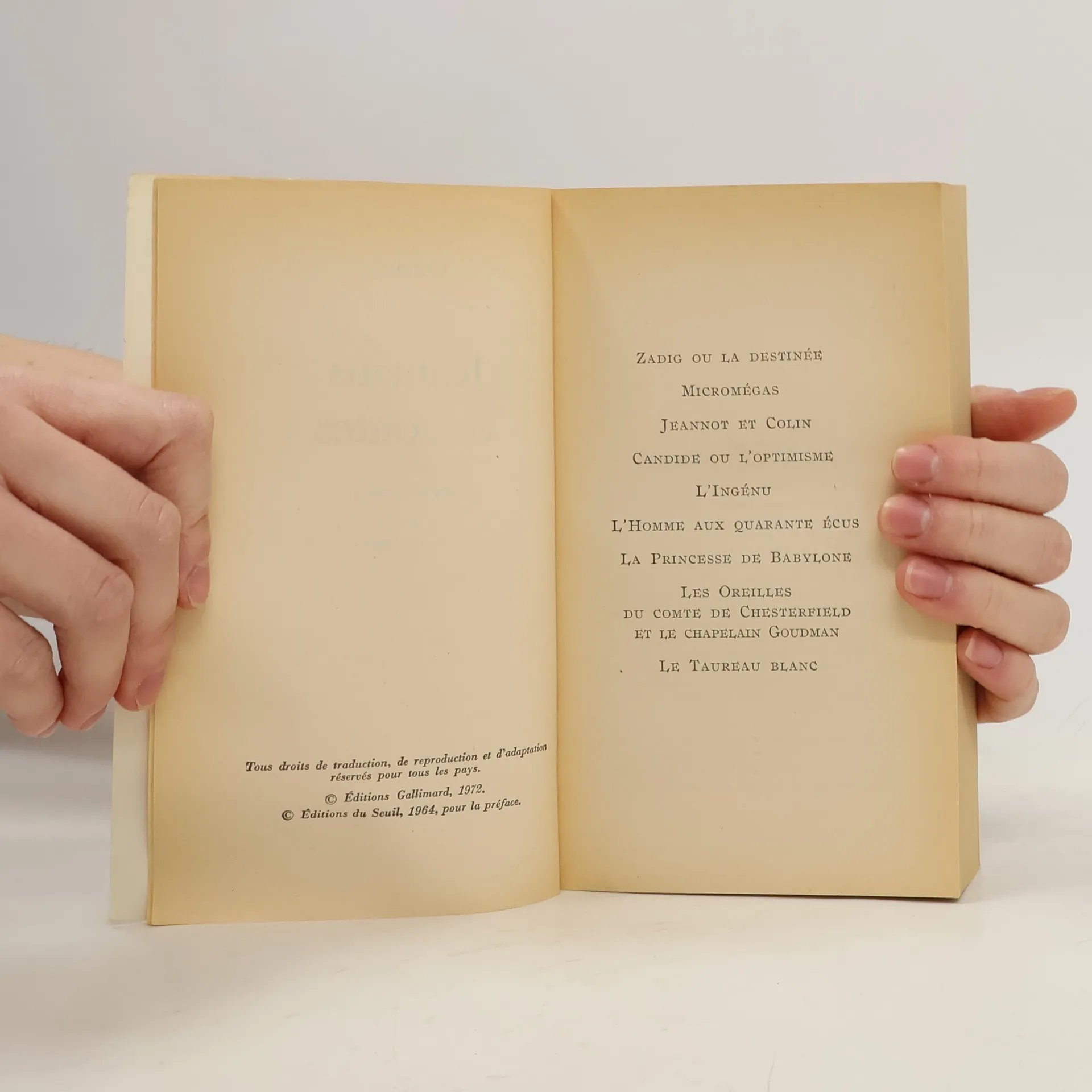 Ce volume contient: Le Crocheteur borgne - Cosi-Sancta - Songe de Platon - Micromégas - Le Monde comme il va - Zadig ou la Destinée - Memnon ou la Sagesse humaine - Lettre d'un Turc - Histoire des voyages de Scarmentado - Les Deux consolés - Candide ou l'Optimisme - Histoire d'un bon bramin - Pot-Pourri - Le Blanc et le noir - Jeannot et Colin - Aventure indienne - L'Ingénu - La Princesse de Babylone - L'Homme aux quarante écus - Les Lettres d'Amabed - Le Taureau blanc - Aventure de la mémoire - Éloge historique de la Raison - Les Oreilles du comte de Chesterfield et le chapelain Goudman - Histoire de Jenni ou le Sage et l'athée. Édition de Frédéric Deloffre et de Jacques Van Den Heuvel.