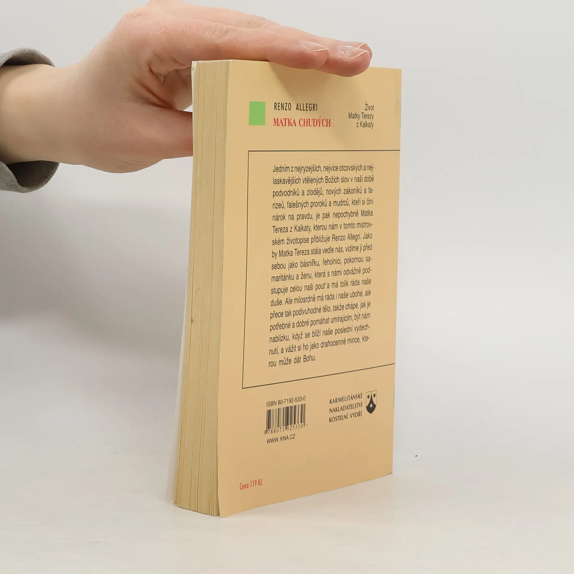 Život Matky Terezy z Kalkaty. Jedním z nejryzejších, nejvíce otcovských a nejlaskavějších vtělených Božích slov v naší době podvodníků a zlodějů, nových zákoníků a farizeů, falešných proroků a mudrců, kteří si činí nárok na Pravdu, je nepochybně Matka Tereza z Kalkaty, kterou nám v tomto mistrovském životopise přibližuje Renzo Allegri. Jakoby Matka Tereza stála vedle nás, vidíme ji před sebou jako básnířku, řeholnici, pokornou samaritánku a ženu, která s námi odvážně podstupuje celou naši pouť a má tolik ráda naše duše. Ale milosrdně má ráda také naše ubohé, a přece tak podivuhodné tělo, takže chápe, jak je potřebné a dobré pomáhat umírajícím, být nám nablízku, když se blíží naše poslední vydechnutí, a vážit si ho jako drahocenné mince, kterou může dát Bohu.