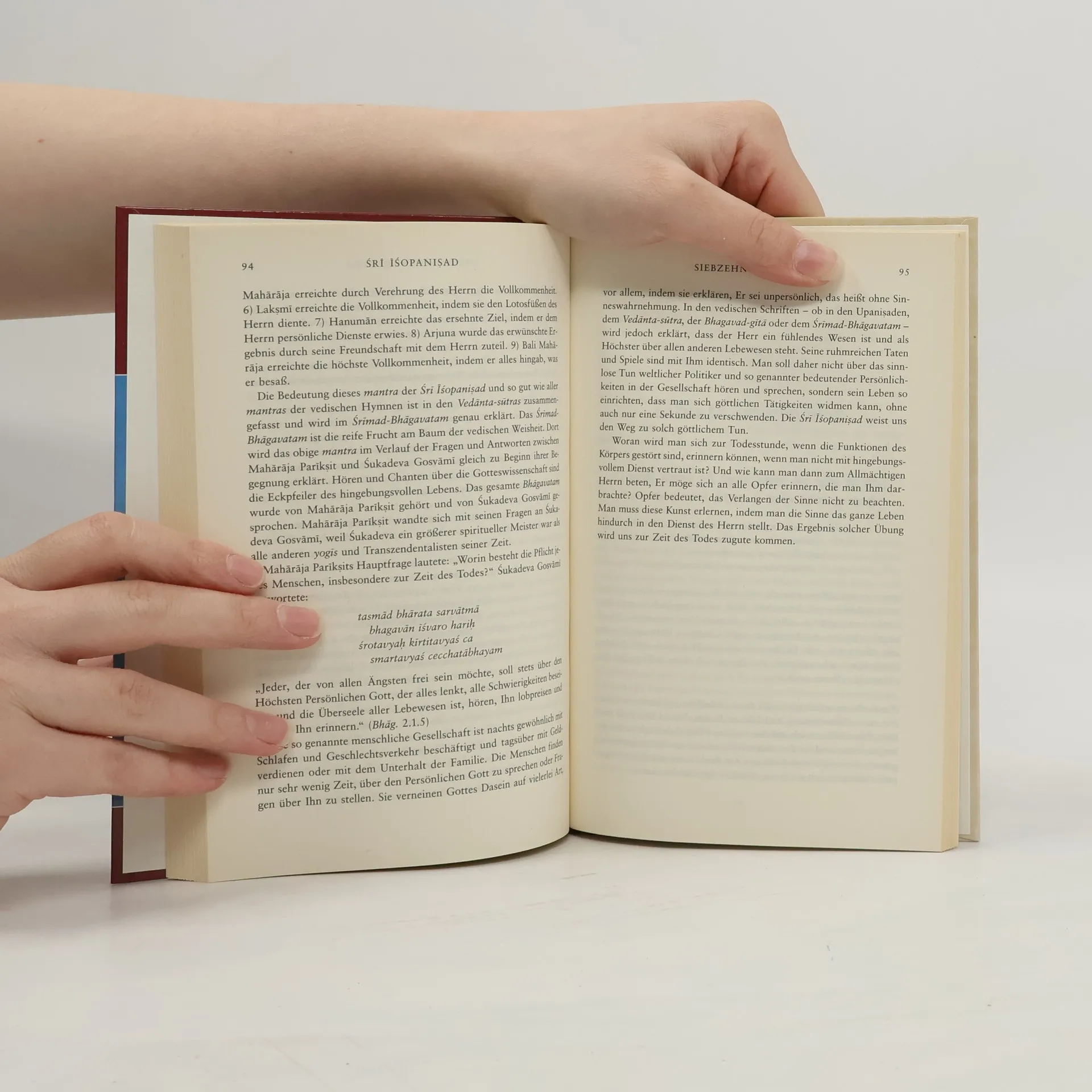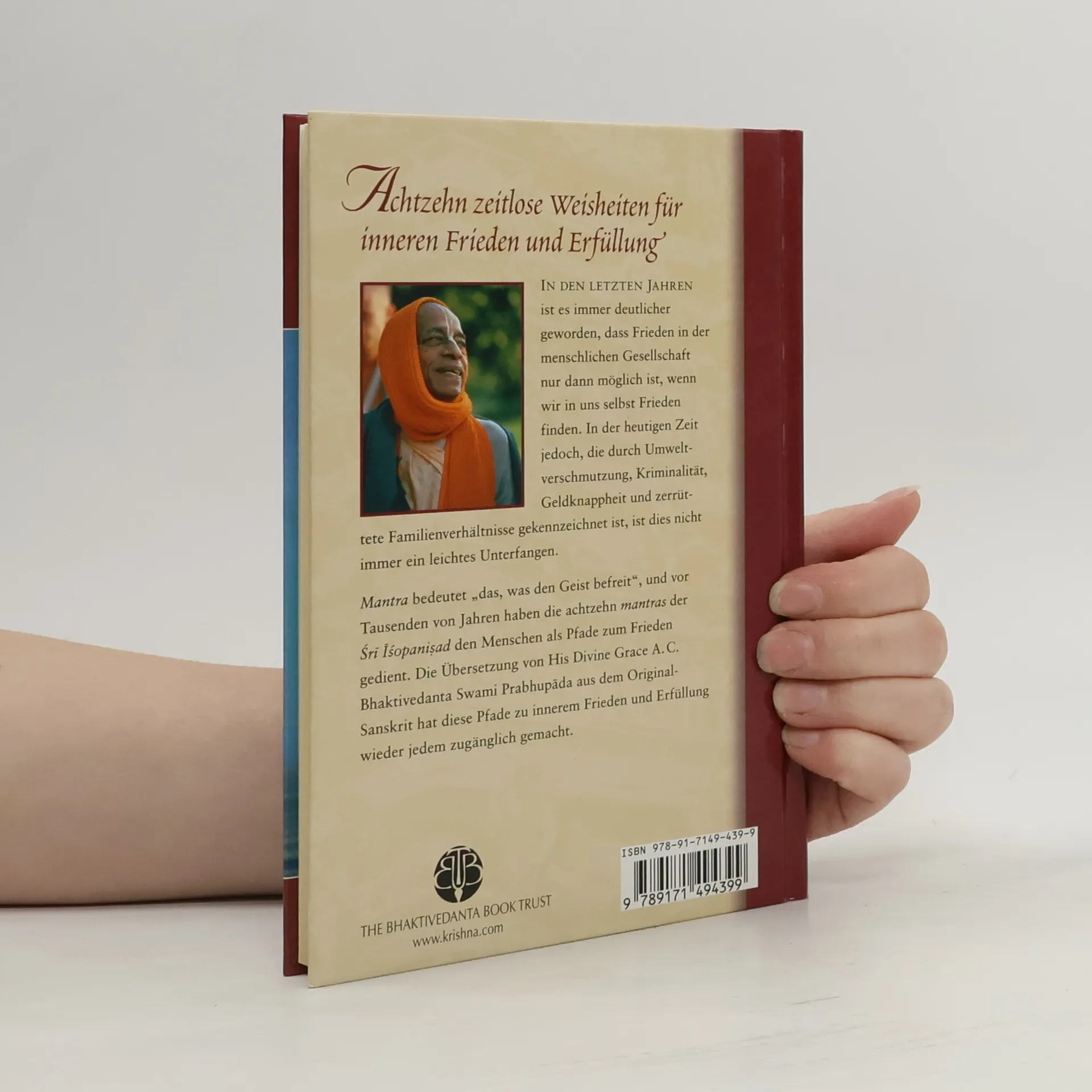 In den letzten Jahren ist es immer deutlicher geworden, dass Frieden in der menschlichen Gesellschaft nur dann möglich ist, wenn wir in uns selbst Frieden finden. In der heutigen Zeit jedoch, die durch Umweltverschmutzung, Kriminalität, Geldknappheit und zerrüttete Familienverhältnisse gekennzeichnet ist, ist dies nicht immer ein leichtes Unterfangen. Mantra bedeutet «das, was den Geist befreit», und vor Tausenden von Jahren haben die achtzehn Mantras der Sri Isopanisad den Menschen als Pfade zum Frieden gedient. Die Übersetzung von His Divine Grace A.C. Bhaktivedanta Swami Prabhupada aus dem Original-Sanskrit hat diese Pfade zu innerem Frieden und Erfüllung jedem zugänglich gemacht.