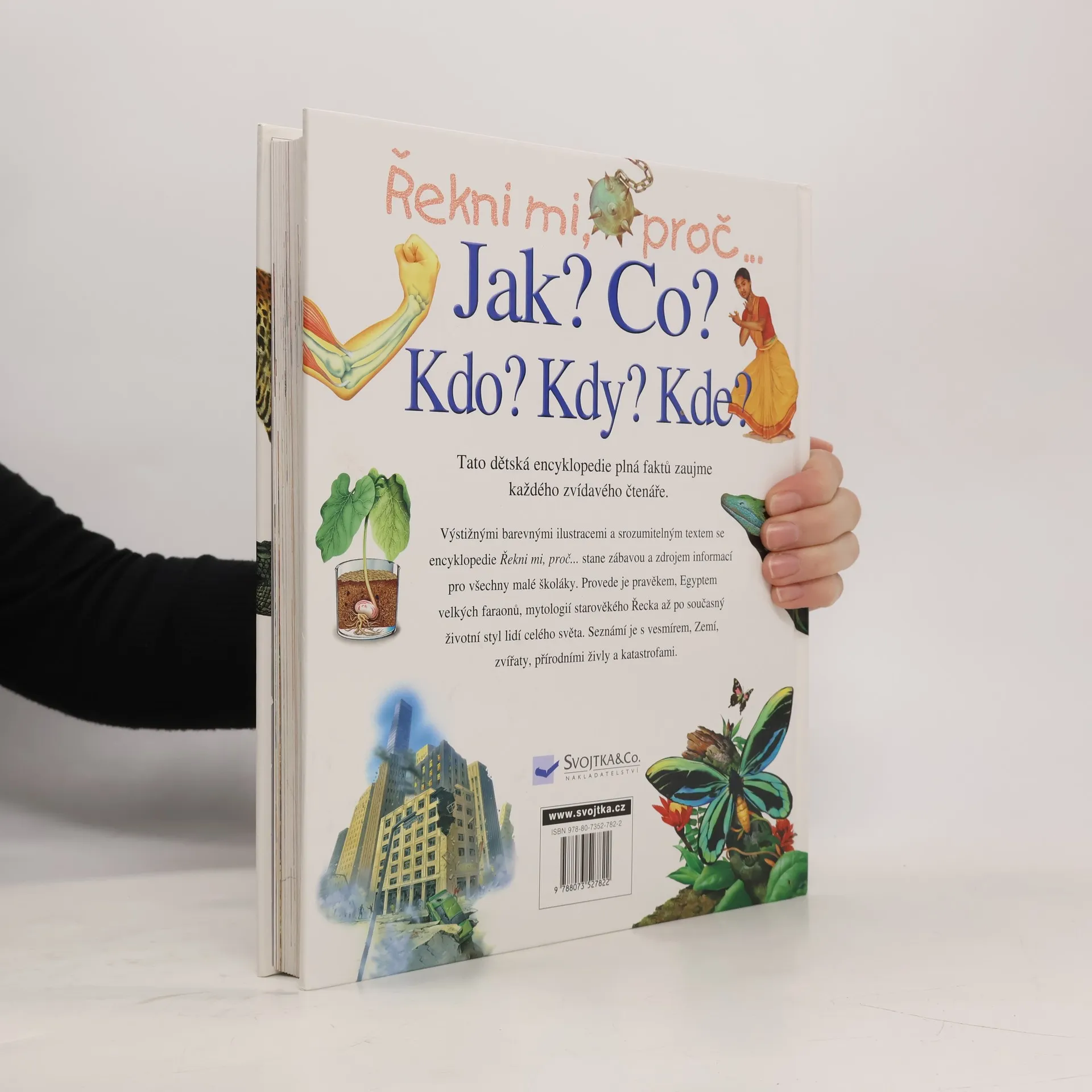 Tato dětská encyklopedie plná faktů zaujme každého zvídavého čtenáře. Výstižnými barevnými ilustracemi a srozumitelným textem se encyklopedie Řekni mi, proč... stane zábavou a zdrojem informací pro všechny malé školáky. Provede je pravěkem, Egyptem velkých faraonů, mytologií starověkého Řecka až po současný životní styl lidí celého světa. Seznámí je s vesmírem, Zemí, zvířaty, přírodními živly i katastrofami, které Zemi postihují.