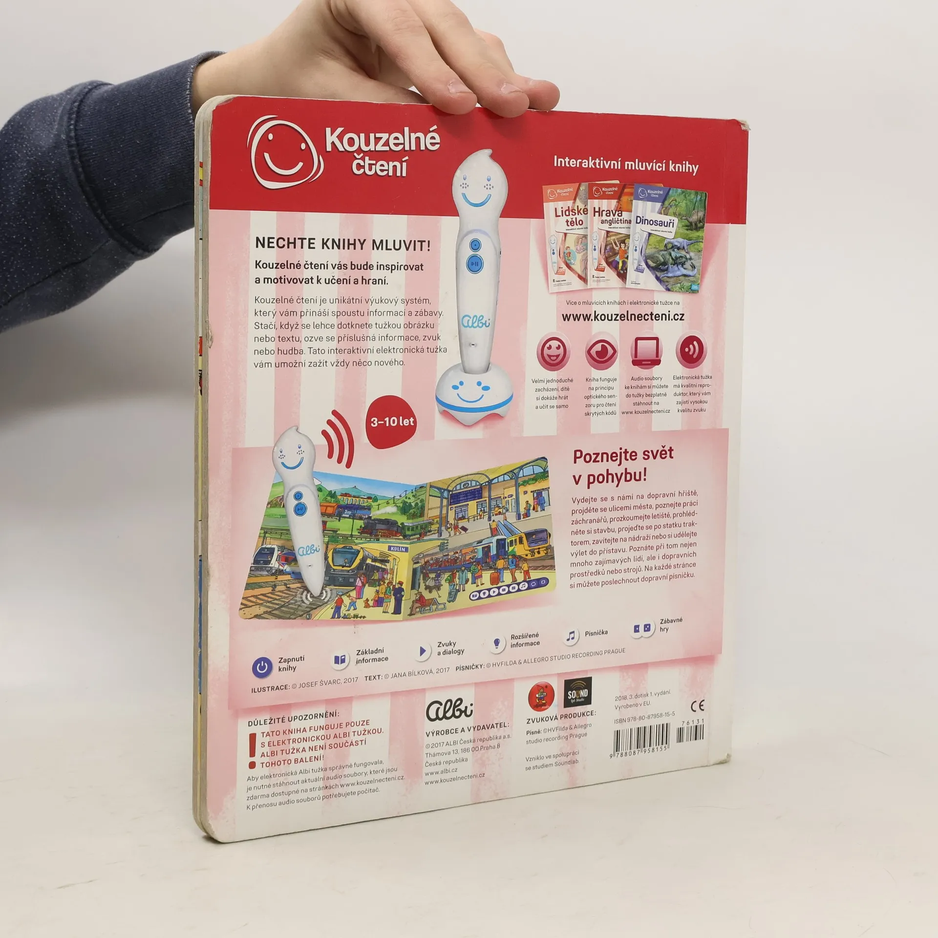 nteraktivní naučná kniha Doprava z edice Kouzelné čtení zavede děti od 3 let do světa dopravních prostředků a strojů. Vydají se na dopravní hřiště, projdou se ulicemi města, poznají práci záchranářů, prozkoumají letiště, prohlédnou si stavbu, projedou se po statku traktorem, zavítají na nádraží a udělají si výlet do přístavu. Interaktivní mluvící kniha Naučí děti bezpečnosti v silničním provozu, poznají dopravní značky a dozví se spoustu užitečných informací ze světa dopravy a strojů. Na každé stránce knihy Doprava si děti poslechnou zábavnou a poučnou dopravní písničku. V knize Doprava se mohou dozvědět i řadu technických detailů o fungování nejrůznějších strojů. Kniha Doprava obsahuje přes 2 000 zvuků a textů. Je namluvena Janou Holcovou a Jaroslavem Pleslem a ilustrovaná Josefem Švarcem.