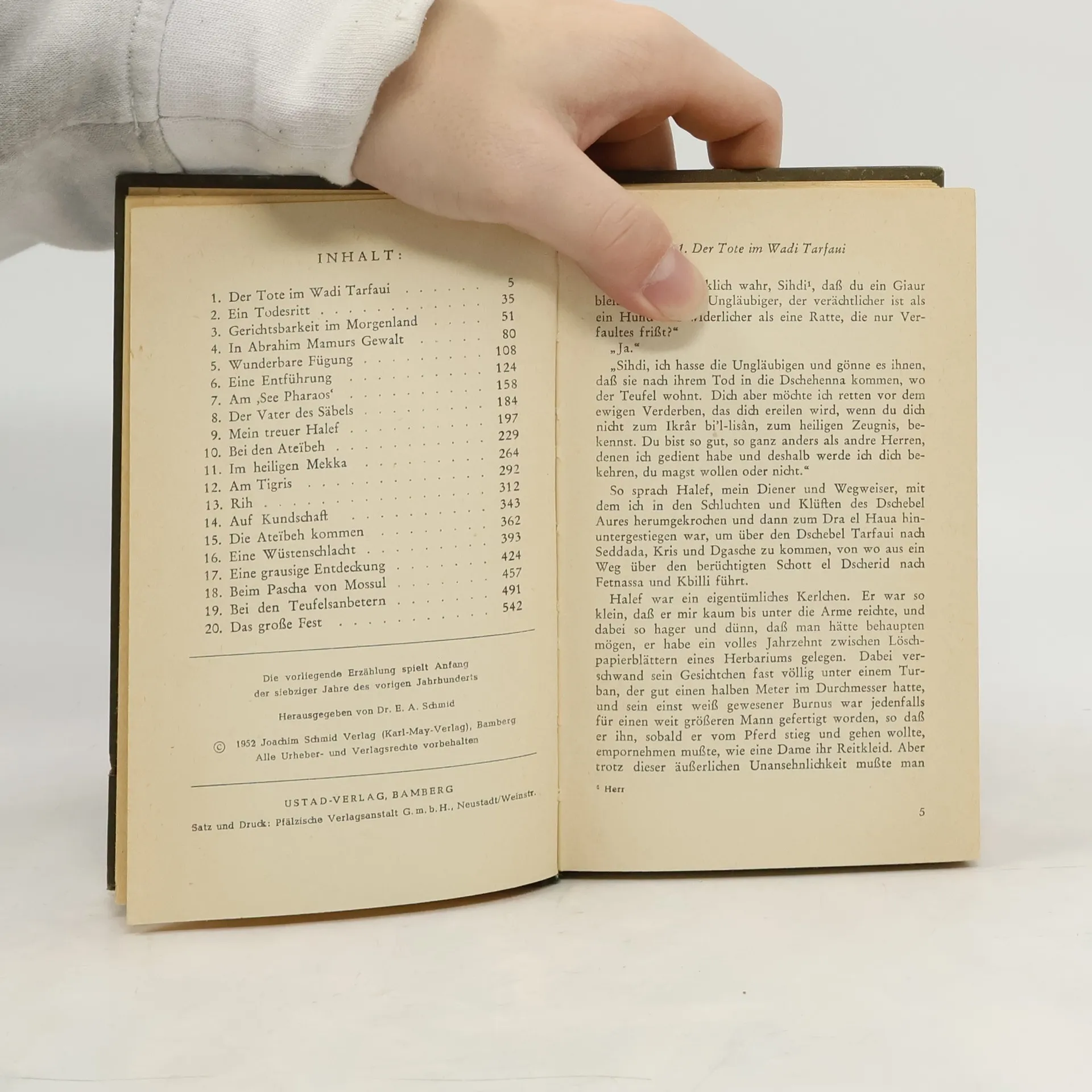 Durch die Wüste reiten Kara Ben Nemsi und Hadschi Halef Omar, sein treuer Gefährte. Der Fund einer Leiche bei den Salzseen Nordafrikas löst ein faszinierendes Abenteuer aus, dessen Folgen den Leser sechs Bände lang in Atem halten. Schon zu Beginn erschließt sich die ganze Buntheit der orientalischen Welt.