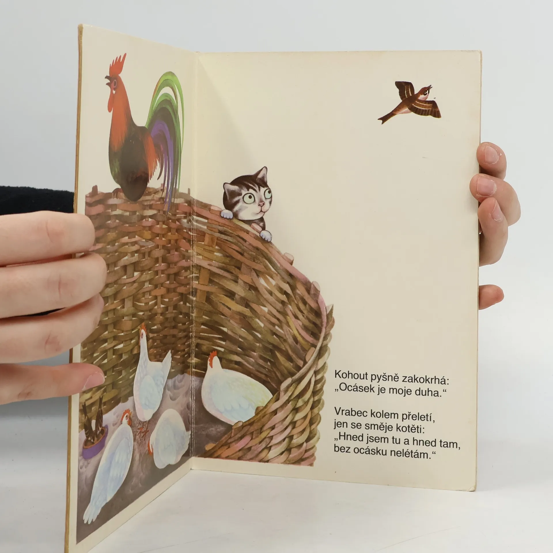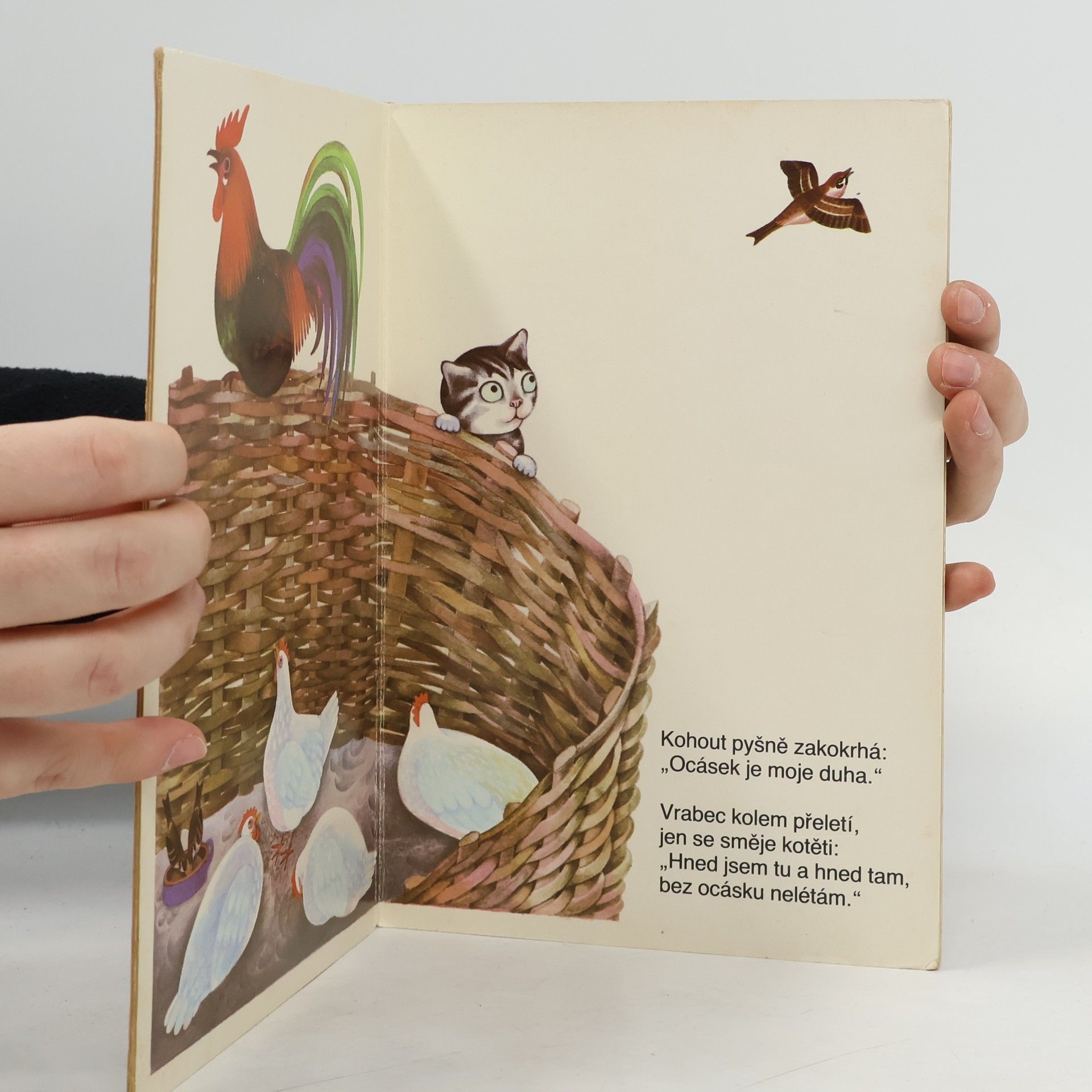 Veršované leporelo, v němž se kotě ptá různých zvířátek, na co má ocásek.