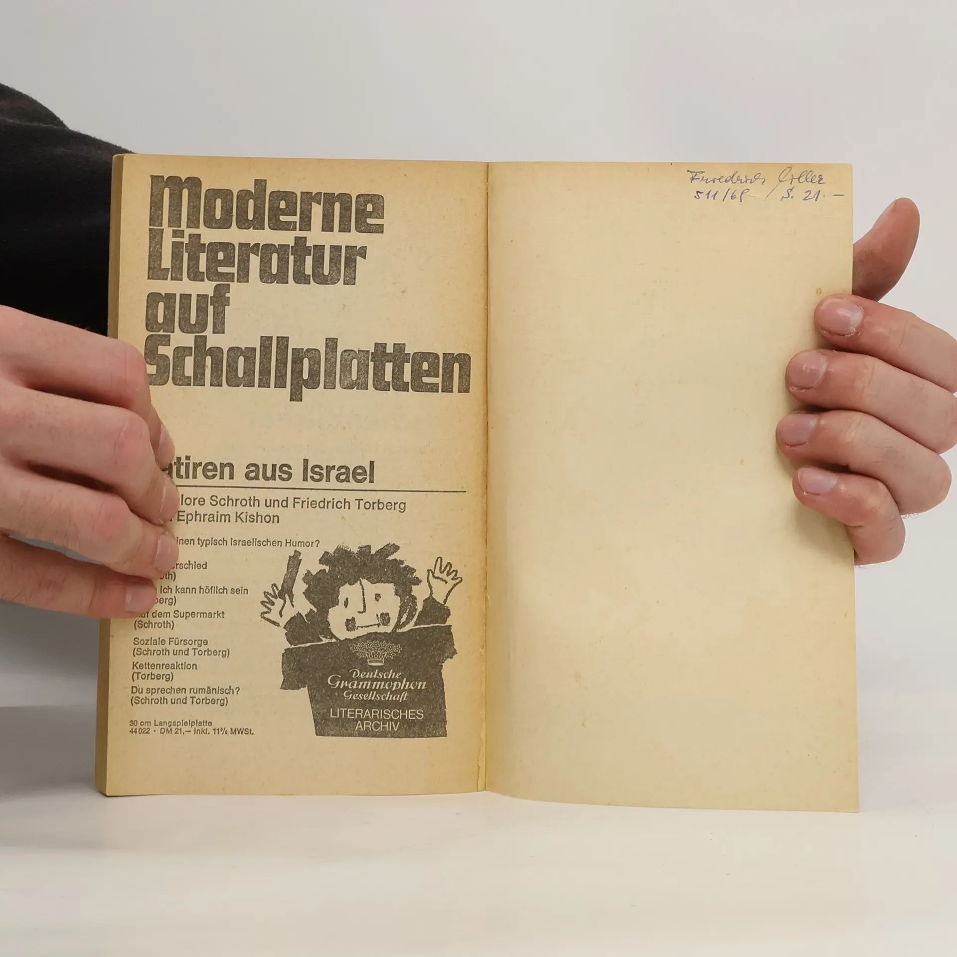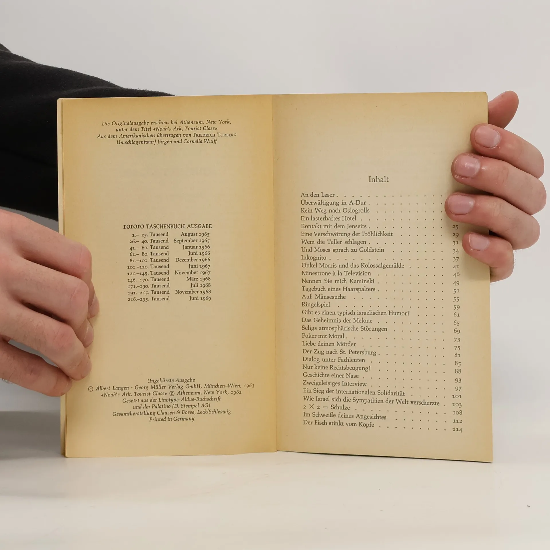 Dies sind 42 Satiren aus dem Land Israel; geschrieben hat sie derselbe Ephraim Kishon, der schon mit seinem ersten Satirenband « Drehn Sie sich um, Frau Lot! » sein Land so liebenswürdig karikierte, daß - nach einem Kritiker-Wort - man am liebsten dorthin auswandern möchte. Dabei schont der scharfsinnige Satiriker seine Landsleute durchaus nicht. Er durchschaut menschliche Schwächen und Eitelkeiten, wo sie im israelischen Alltag bemerkbar werden oder wo auch sie sich verbergen möchten. In banalen Begebenheiten entdeckt er Widersinn und Hintergründigkeiten, und was ihm absurd vorkommt an scheinbaren Normen, an eingeübten Verhaltensweisen: er nennt es beim Namen, er sagt sein entlarvendes Wort. Aber so genau sein Witz trifft, seine Wahrheiten bleiben doch versöhnlich und bekennen ein, daß trotz aller Unzulänglichkeiten das Leben heute lebenswert bleibt. Es bedarf nur der genauen Beobachtung, der Korrektur und der Kritik, und indem Kishon all das mit seinen Satiren leistet, verhilft er nicht nur seinen Landsleuten zur Erkenntnis ihrer selbst, ihrer Schwächen, ihrer Ticks und Marotten. So finden diese so oft beißenden Satiren ihren Sinn darin, daß sie die Fehler in dieser Welt korrigieren helfen. Inhalt: - An den Leser - Überwältigung in A-Dur - Kein Weg nach Oslogrolls - Ein lasterhaftes Hotel - Kontakt mit dem Jenseits - Eine Verschwörung der Fröhlichkeit - Wem die Teller schlagen - Und Moses sprach zu Goldstein - Inkognito - Onkel Morris und das Kolossalgemälde - Minestrone à la Television - Nennen Sie mich Kaminski - Tagebuch eines Haarspalters - Auf Mäusesuche - Ringelspiel - Gibt es einen typisch israelischen Humor? - Das Geheimnis der Melone - Seligs atmosphärische Störungen - Poker mit Moral - Liebe deinen Mörder - Der Zug nach St. Petersburg - Dialog unter Fachleuten - Nur keine Rechtsbeugung! - Geschichte einer Nase - Zweigleisiges Interview - Ein Sieg der internationalen Solidarität - Wie Israel sich die Sympathien der Welt verscherzte - 2 x 2 = Schulze - Im Schweiße deines Angesichts - Der Fisch stinkt vom Kopfe - Ein Vater wird geboren - Kleine Beinchen, trippel-trapp - Vertrauen gegen Vertrauen - Ein ehrlicher Finder - Die Medikamenten-Staffette - Warten auf Nebenzahl - Wie man ein Buch bespricht, ohne es zu lesen - Der Erfolgsmesser - Gäste willkommen - T-14948 - Die heilsamen Schildchen - Falscher Alarm - Keine Sorge