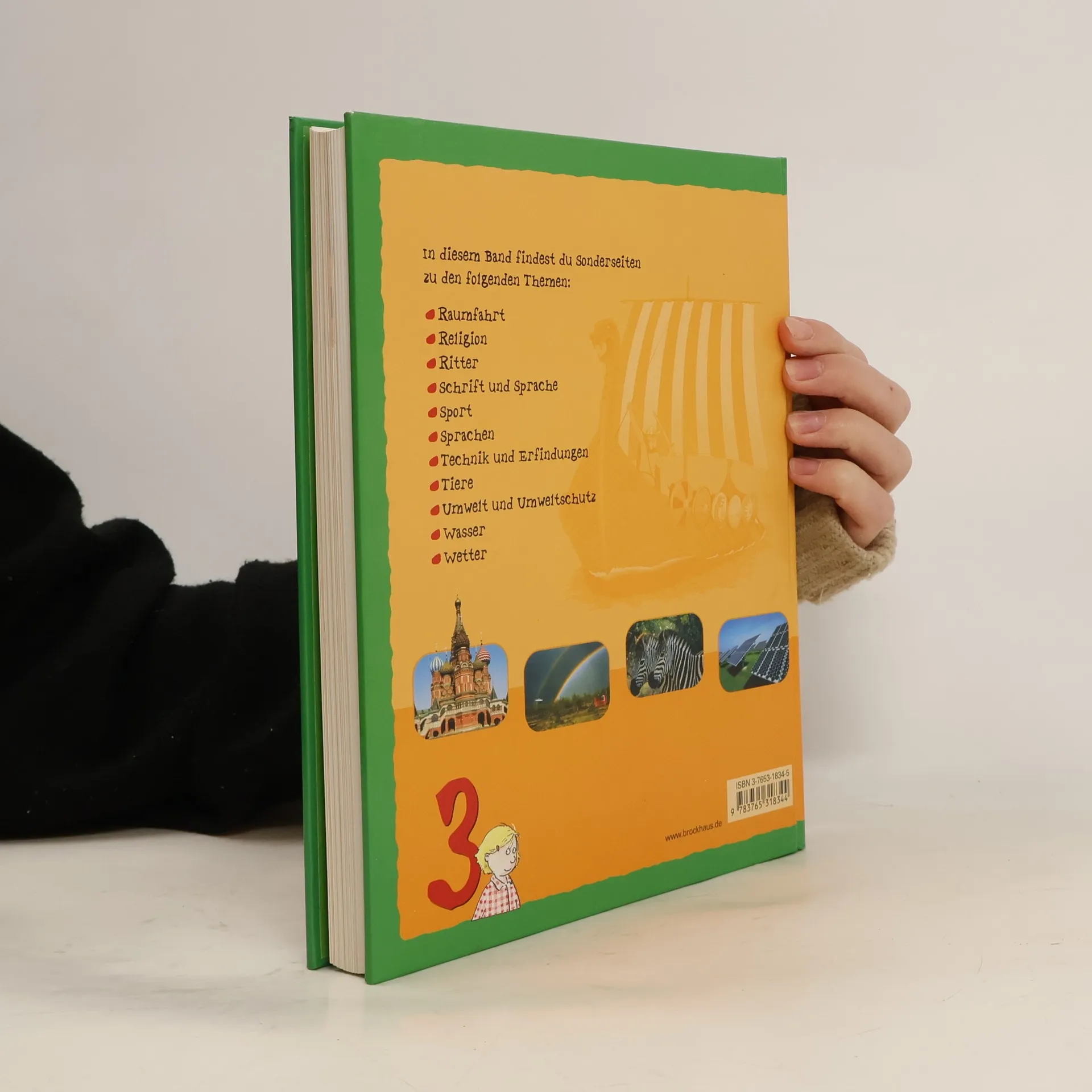 Ein gut aufgemachtes und nützliches Kinderlexikon: Das Kinderlexikon ist alphabetisch geordnet und unterteilt auf drei handliche Bände in einer Kartonbox. Textgliederung, farbige Kasten (Länder, Experimente, Wer-wann-wo?, Rekorde), rote Stichwörter, blaue Internetadressen, Querverweise, Tipps zum Nachschlagen, Grafiken und Fotos tragen zur Übersicht und zur Anschaulichkeit bei. Kleine sachbezogene Quizfragen finden im Anhang ihre Auflösung. Im dritten Band ist das gesamte Register zusammengefasst. 32 Doppelseiten beschäftigen sich mit umfassenderen Themen wie Raumfahrt, Energie, Computer, Musik etc. Der kleine Brockhaus dient in der Primarschule als prima Arbeitshilfe und als anregende freie Lektüre zur Interessenbildung. Ab 8 Jahren, ausgezeichnet, Ruedi W. Schweizer.