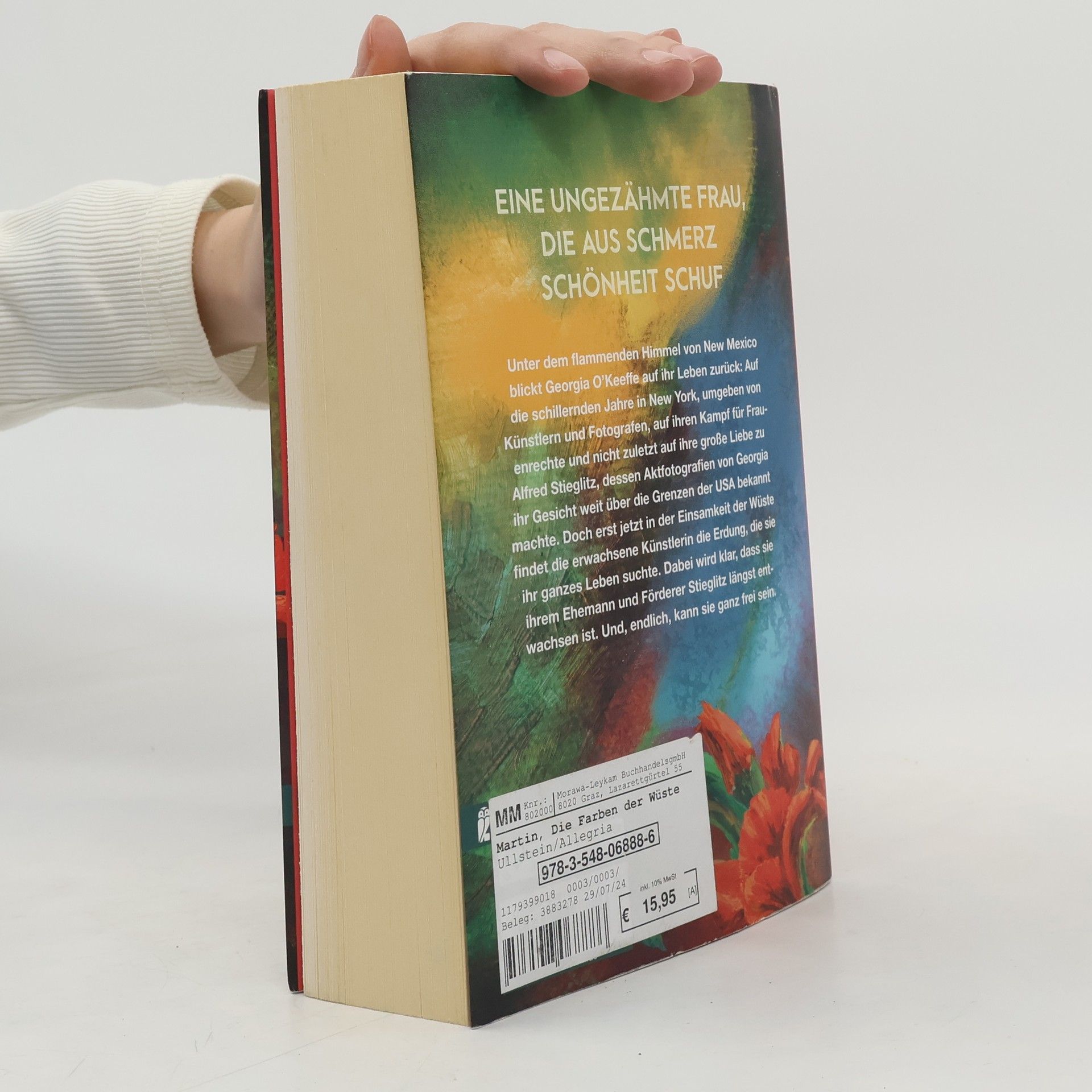 Ihre Blumenbilder machten sie weltberühmt – dabei schuf sie Schönheit aus großem Schmerz Die erwachsene Georgia O'Keeffe blickt zurück auf ihr Leben: Auf die schillernden Jahre in New York, wo sie umgeben von Künstlern und Fotografen wilde Jahre verbringt; ihr politisches Engagement bei der National Woman's Party, nicht zuletzt auf ihre große Liebe zu Alfred Stieglitz, dessen Aktfotografien von Georgia ihr Gesicht weit über die Grenzen der USA bekannt macht. Als sie – bereits in ihren Fünfzigern – in der Ruhe ihrer Ranch in New Mexico endlich die Erdung findet, die sie ihr ganzes Leben gesucht hat, wird klar, dass sie ihrem Ehemann und Förderer Stieglitz längst entwachsen ist: Unbeirrt geht sie ihren steinigen Weg zu einer Kunst, die dem Leben in all seiner morbiden Vollkommenheit huldigt, und wird damit unsterblich. Die Farben der Wüste ist ein zutiefst sinnlicher Roman über eine ungezähmte Frau, der die Fans von Frida Kahlo und Hilma af Klimt begeistern wird.