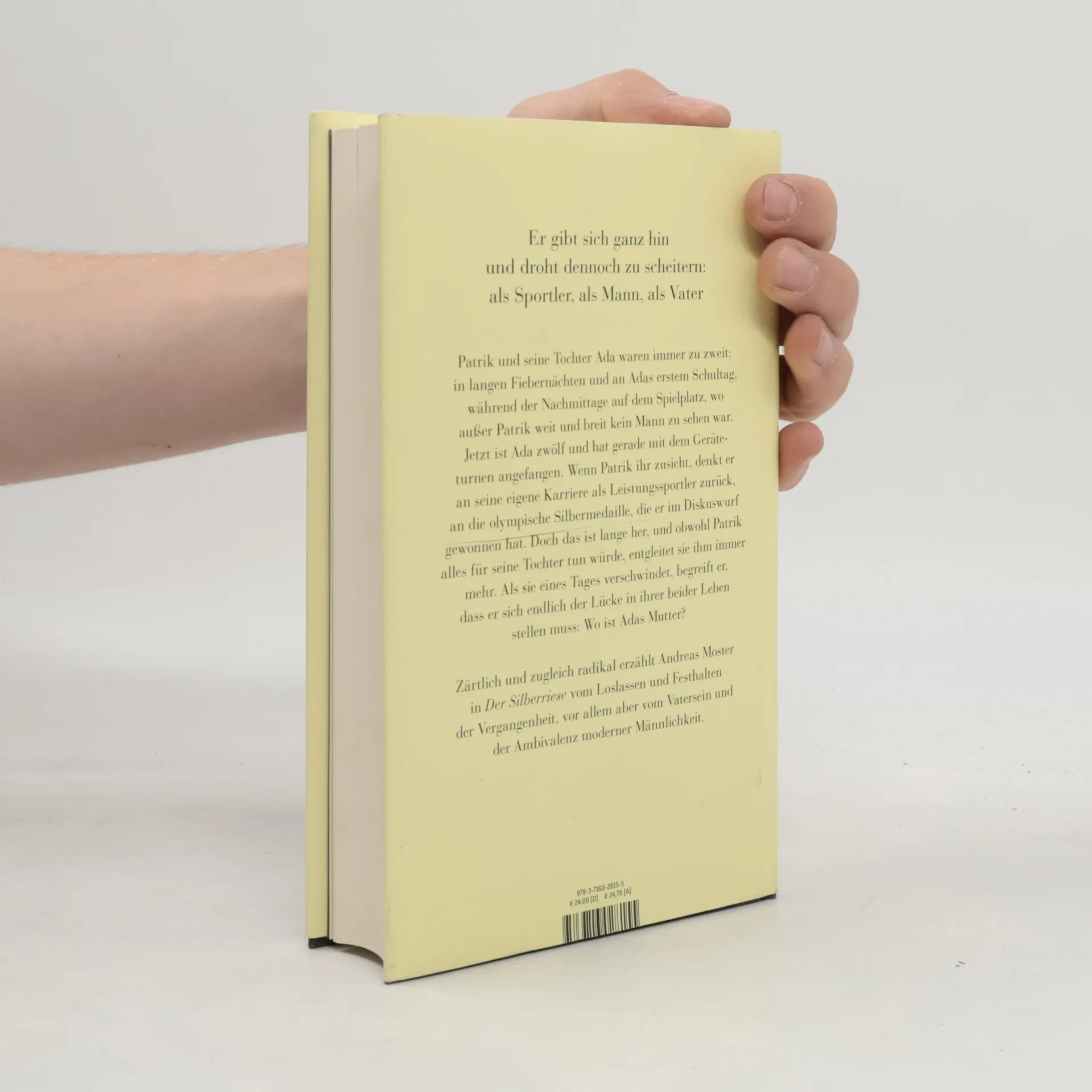 Er gibt sich ganz hin und droht dennoch zu scheitern – als Sportler, als Mann und vor allem als Vater Patrik und seine zwölfjährige Tochter Ada waren immer zu zweit. Gerade sind sie wieder einmal umgezogen, und Ada hat mit dem Geräteturnen angefangen. Wenn Patrik zusieht, wie sie mit zusammengebissenen Zähnen am Stufenbarren hängt, denkt er an seine eigene Karriere als Leistungssportler zurück. Doch die olympische Silbermedaille, die er einst im Diskuswurf gewonnen hat, liegt verstaubt in der Schublade. Während Patrik und Ada zusammen trainieren und versuchen, sich in dem neuen Leben einzurichten, driften sie immer weiter auseinander. Je mehr sie ihm entgleitet, desto heftiger fallen Patrik Erinnerungen an all die Jahre mit seiner Tochter an. Der verzweifelte erste Versuch, sie zum Trinken aus dem Fläschchen zu bewegen, die Nachmittage auf dem überfüllten Spielplatz, wo weit und breit kein Mann zu sehen war, schon gar kein kraftstrotzender Hüne wie er. Als Ada eines Tages verschwindet, begreift Patrik, dass er sich endlich der Lücke in ihrer beider Leben stellen muss: Wo ist Adas Mutter?