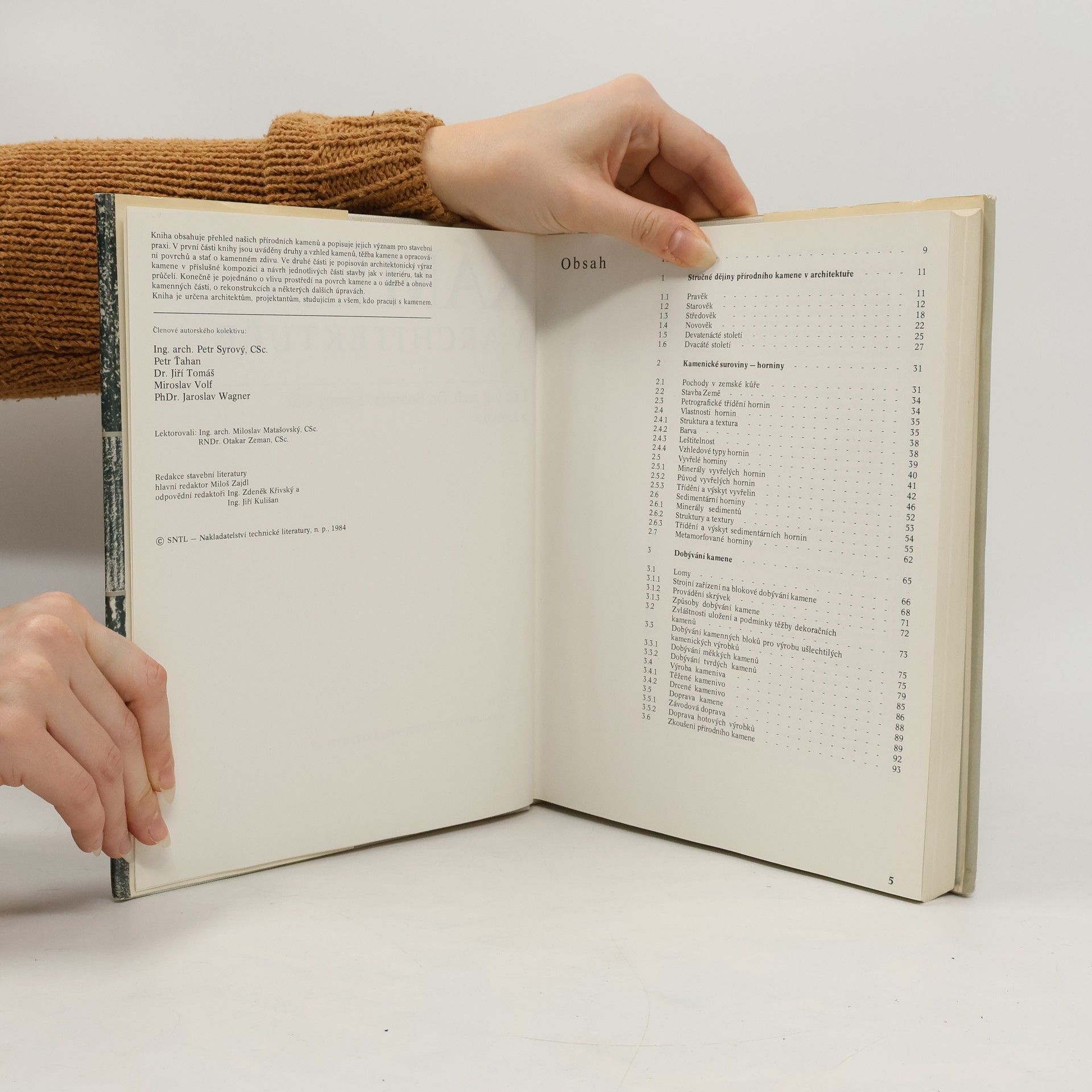 Stručné dějiny přírodního kamene v architektuře, Kamenické suroviny-horniny, Dobývání kamene, Opracování přírodního kamene, Kamenické výrobky, Kamenné konstrukce, Volba druhu kamene a jeho opracování, Kámen v architektonické kompozici, Kámen a čas, Budoucnost přírodního kamene v architektuře.