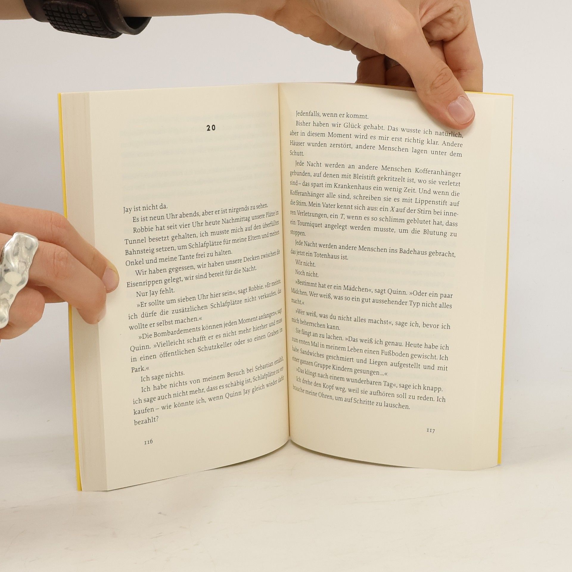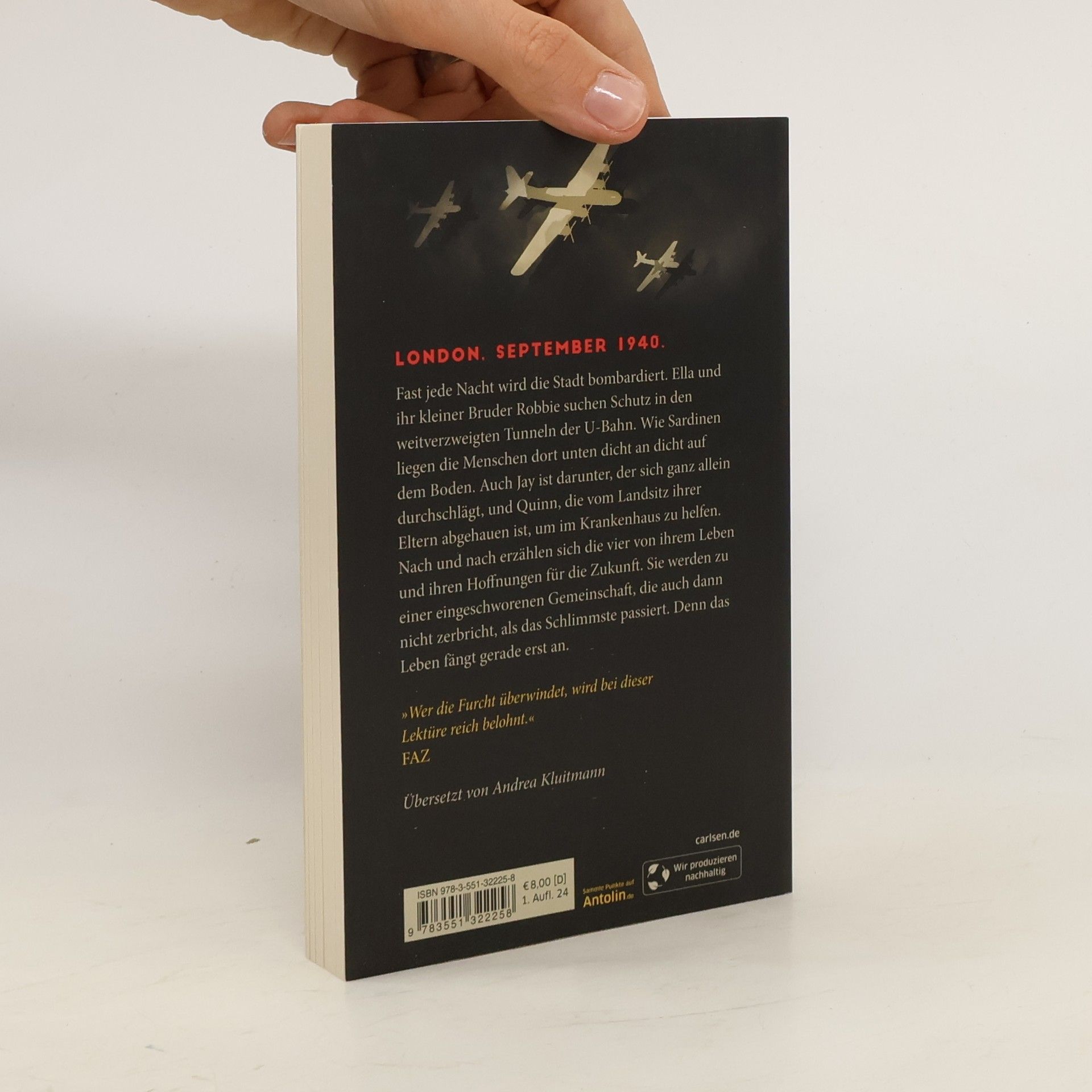 Wir drei haben alles überstanden. Die Bomben, die Brände, die Nächte. Wir sind noch da. Unser Leben fängt gerade erst an. London, September 1940. Fast jede Nacht wird die Stadt bombardiert. Ella und ihr kleiner Bruder Robbie suchen Schutz in den weitverzweigten Tunneln der U-Bahn. Wie Sardinen liegen die Menschen dort unten dicht an dicht auf dem Boden. Auch Jay ist darunter, der sich ganz allein durchschlägt, und Quinn, die vom Landsitz ihrer Eltern abgehauen ist, um im Krankenhaus zu helfen. Nach und nach erzählen sich die vier von ihrem Leben und ihren Hoffnungen für die Zukunft. Sie werden zu einer eingeschworenen Gemeinschaft, die auch dann nicht zerbricht, als das Schlimmste passiert. Eine starke Protagonistin voller Hoffnung in einem ebenso herzzerreißenden wie zuversichtlichen Buch über ein nach wie vor aktuelles Thema. Anna Woltz gehört zu den ganz großen Stimmen der internationalen Kinder- und Jugendliteratur. Mit den unvergesslichen Kindern und Jugendlichen aus ihren Büchern möchte man sich augenblicklich anfreunden. Warmherzig und fesselnd erzählt sie konsequent aus deren Sicht und behandelt so auch schwierige Themen unerschrocken, mit großem Feingefühl und Sprachwitz. Ausgezeichnet mit dem Gustav-Heinemann-Friedenspreis