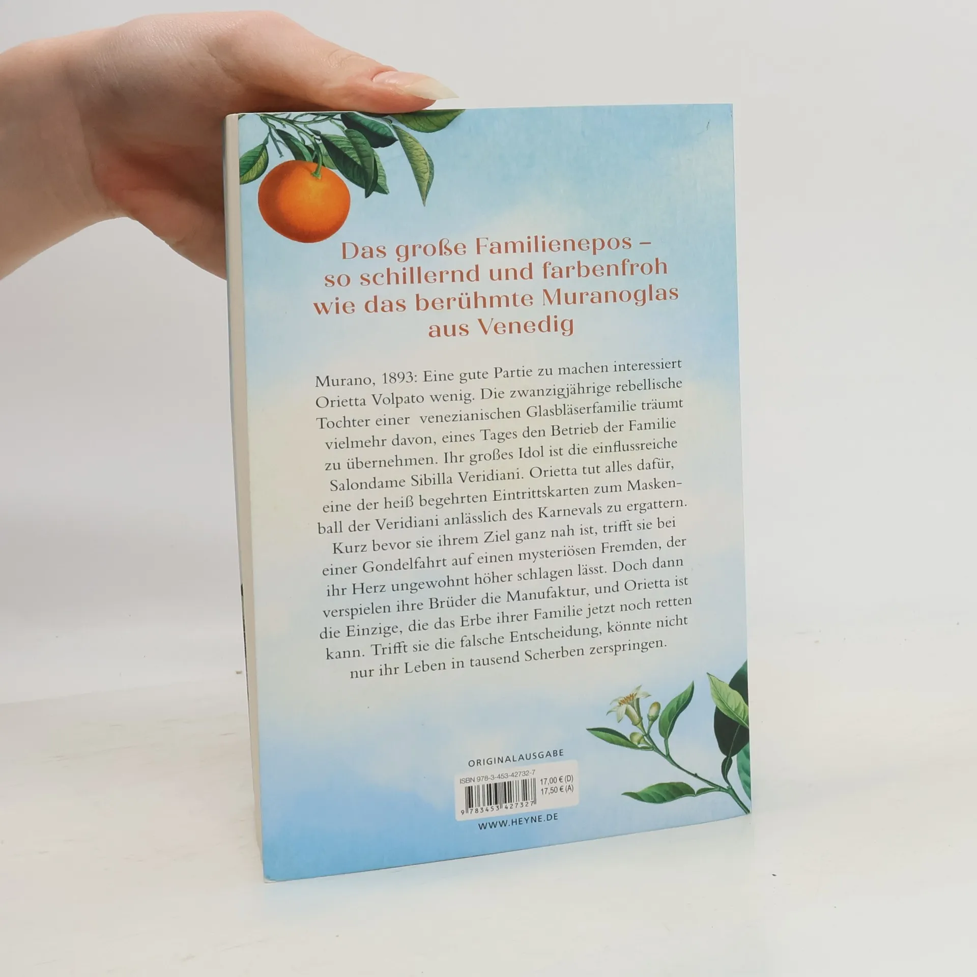 Wo Träume aus Feuer und Sand entstehen Murano, 1893: Eine gute Partie zu machen interessiert Orietta Volpato wenig. Als rebellische Tochter einer venezianischen Glasbläserfamilie träumt die Zwanzigjährige vielmehr davon, eines Tages den Betrieb der Familie zu übernehmen. Ihr großes Idol ist die einflussreiche Salondame Sibilla Veridiani. Orietta tut alles dafür, eine der heißbegehrten Eintrittskarten zum Maskenball der Veridiani anlässlich des Karnevals zu ergattern. Kurz bevor sie ihrem schillernden Traum ganz nah ist, trifft sie bei einer Gondelfahrt auf einen mysteriösen Fremden, der ihr Herz ungewohnt höherschlagen lässt. Doch dann verspielen ihre Brüder die Manufaktur, und Orietta ist die Einzige, die das Erbe ihrer Familie jetzt noch retten kann. Trifft sie die falsche Entscheidung, könnte nicht nur ihr Leben in tausend Scherben zerspringen.