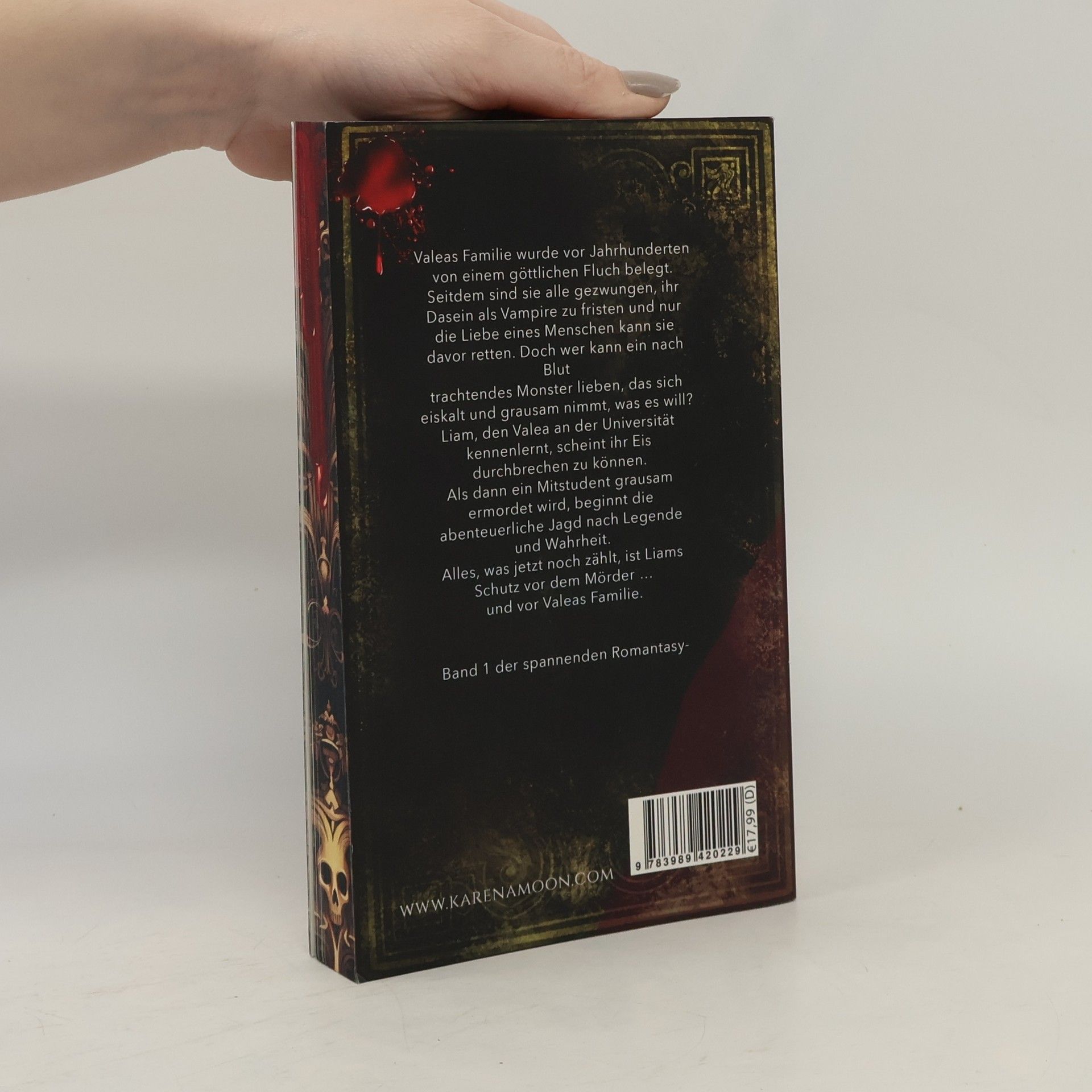Valeas Familie wurde vor Jahrhunderten von einem göttlichen Fluch belegt. Seitdem sind sie alle gezwungen, ihr Dasein als Vampire zu fristen und nur die Liebe eines Menschen kann sie davor retten. Doch wer kann ein nach Blut trachtendes Monster lieben, das sich eiskalt und grausam nimmt, was es will? Liam, den Valea an der Universität kennenlernt, scheint ihr Eis durchbrechen zu können. Als dann ein Mitstudent brutal ermordet wird, beginnt die abenteuerliche Jagd nach Legende und Wahrheit. Alles, was jetzt noch zählt, ist Liams Schutz vor dem Mörder … und vor Valeas Familie. Band 1 der sinnlichen Romantasy-Dilogie mit Vampiren, Dämonen, Göttern und Hexen ab 16 Jahren.