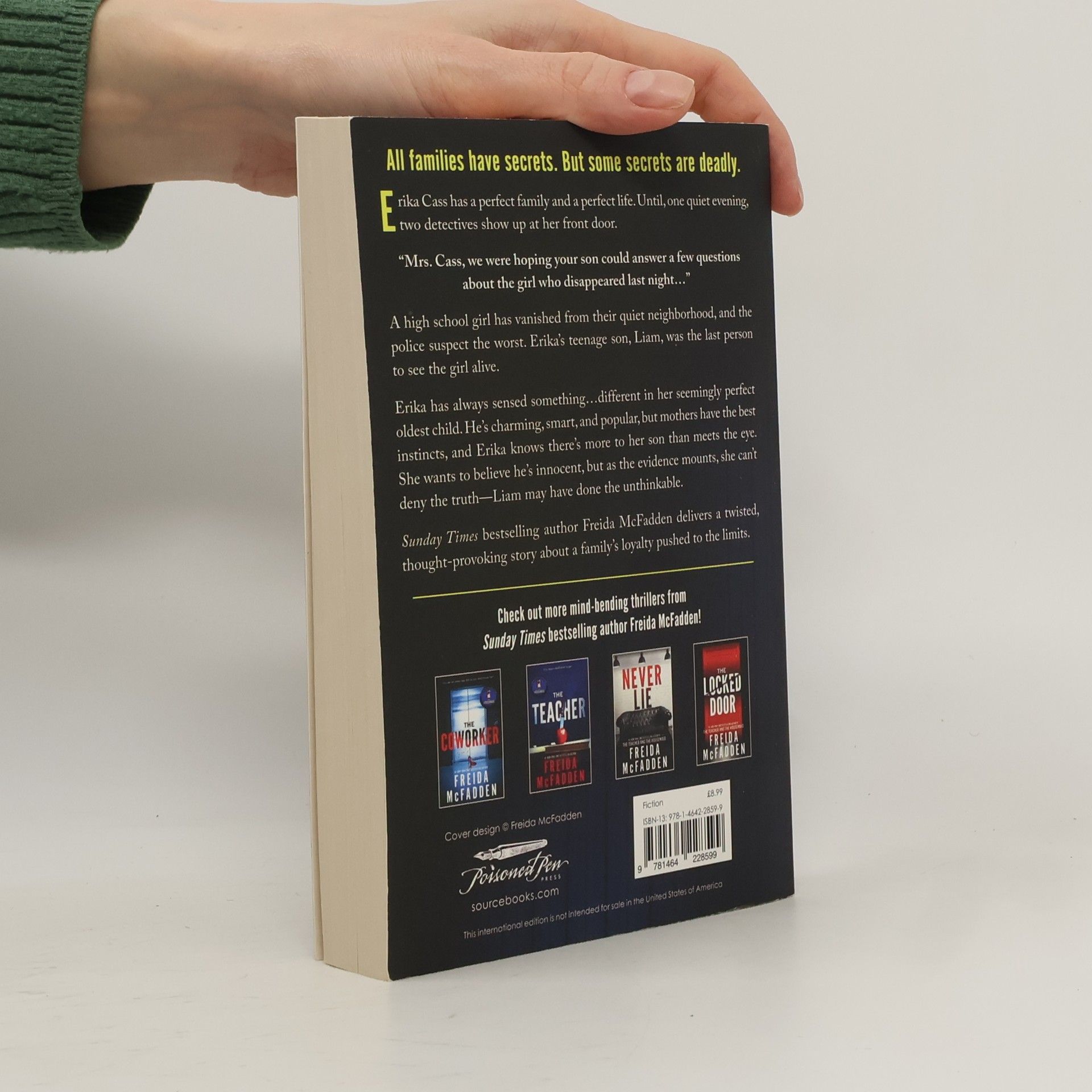 From Sunday Times bestselling author Freida McFadden comes a dark and twisting psychological thriller about a mother who suspects her son of committing a terrible crime... But how far will she go to protect her family? All families have secrets. But some secrets are deadly.Erika Cass has a perfect family and a perfect life. Until, one quiet evening, two detectives show up at her front door.Mrs. Cass, we were hoping your son could answer a few questions about the girl who disappeared last night...A high school girl has vanished from their quiet neighbourhood, and the police suspect the worst. Erika's teenage son, Liam, was the last person to see the girl alive.Erika has always sensed something... different in her seemingly perfect oldest child. He's charming, smart and popular, but mothers have the best instincts. Erika knows there's more to her son than meets the eye. She wants to believe he's innocent, but as the evidence mounts, she can't deny the truth?Liam may have done the unthinkable.With The Perfect Son, bestselling author Freida McFadden delivers a twisted, thought-provoking crime thriller about a family's loyalty pushed to the limits.