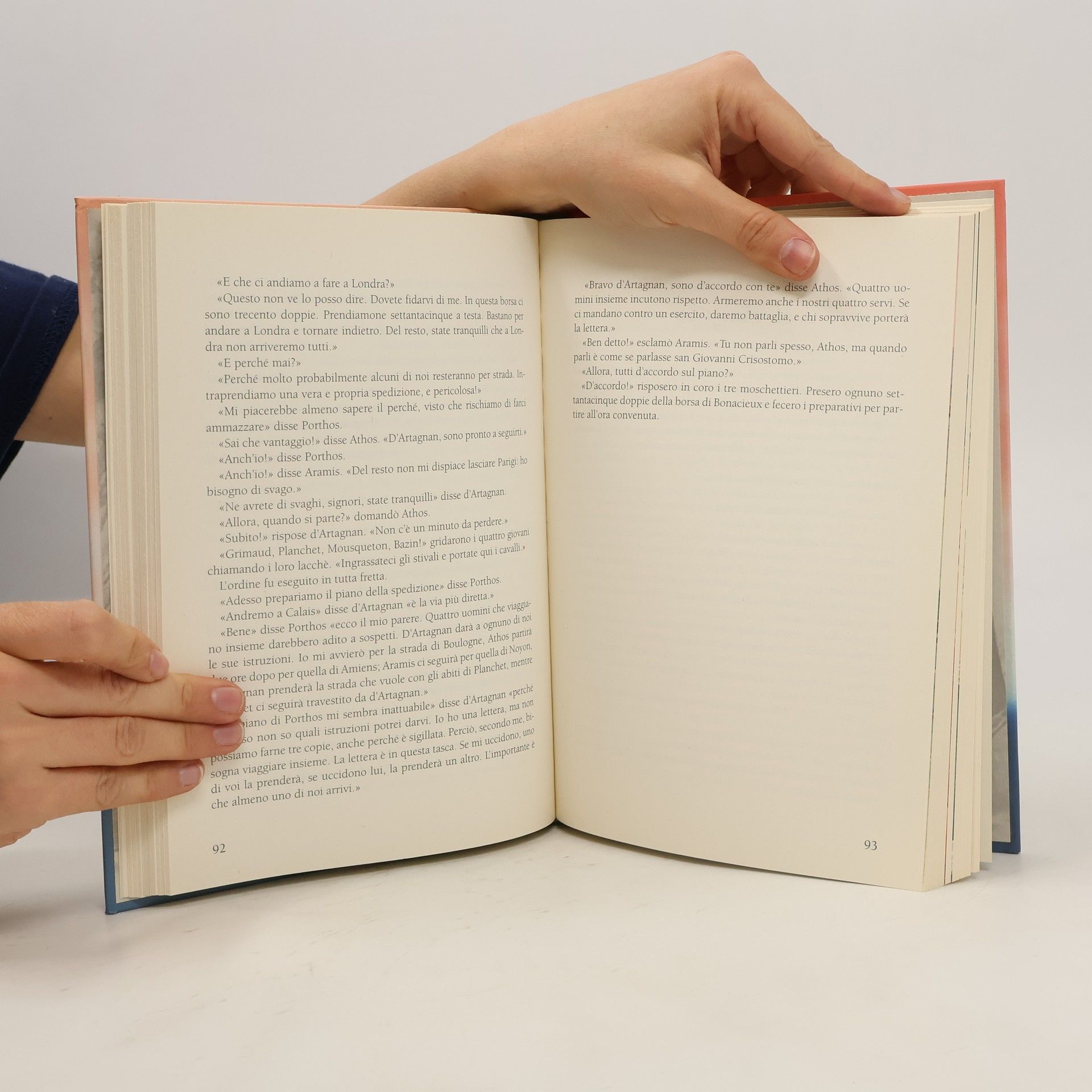 Beato colui che per la prima volta si accinge a inseguire le orme di d'Artagnan - beato colui che, avendo letto questo libro nell'adolescenza, come accade, in una edizione probabilmente ornata di traumatizzanti illustrazioni, non ne conserva che un confuso ricordo, fatto di generosi e un po' sciocchi duelli, di trame ingegnose, di agevoli uccisioni; attendono costoro alcune ore di indifesa, deliziata lettura... Una velocissima cavalcata, che si svolge con accelerazione sempre più nervosa e rovinosa, ci rapisce, per le strade di Francia e di Inghilterra, sulle tracce di d'Artagnan e dei tre moschettieri; in preda ad un batticuore lievemente degradante, gustando tutta la codarda letizia di essere 'fuori', noi seguiamo le ambagi di una storia seducente quanto sfrontatamente improbabile. Di rado siamo commossi, mai coinvolti, ma costantemente eccitati, provocati, elusi...