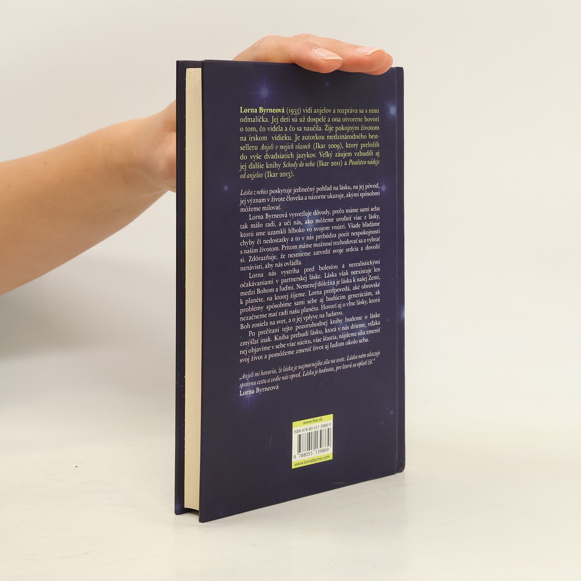 Láska z nebies poskytuje jedinečný pohľad na lásku, na jej pôvod, jej význam v živote človeka a názorne ukazuje, akými spôsobmi môžeme milovať. Lorna Byrneová vysvetľuje dôvody, prečo máme sami seba tak málo radi, a učí nás, ako môžeme uvoľniť viac z lásky, ktorú sme uzamkli hlboko vo svojom vnútri. Všade hľadáme chyby či nedostatky a to v nás prebúdza pocit nespokojnosti s naším životom. Pritom máme možnosť rozhodovať sa a vybrať si. Zdôrazňuje, že nesmieme zatvrdiť svoje srdcia a dovoliť nenávisti, aby nás ovládla. Lorna nás vystríha pred bolesťou a nerealistickými očakávaniami v partnerskej láske. Láska však neexistuje len medzi Bohom a ľuďmi. Nemenej dôležitá je láska k našej Zemi, k planéte, na ktorej žijeme. Lorna predpovedá, aké obrovské problémy spôsobíme sami sebe aj budúcim generáciám, ak nezačneme mať radi našu planétu. Hovorí aj o vlne lásky, ktorú Boh zosiela na svet, a o jej vplyve na ľudstvo. Po prečítaní knihy budeme o láske zmýšľať inak. Kniha prebudí lásku, ktorá v nás drieme, vďaka nej objavíme v sebe viac súcitu, viac šťastia, nájdeme silu zmeniť svoj život a pomôžeme zmeniť život aj ľuďom okolo seba. „Anjeli mi hovoria, že láska je najmocnejšia sila na svete. Láska nám ukazuje správnu cestu a vedie nás vpred. Láska je hodnota, pre ktorú sa oplatí žiť.“ Lorna Byrneová.