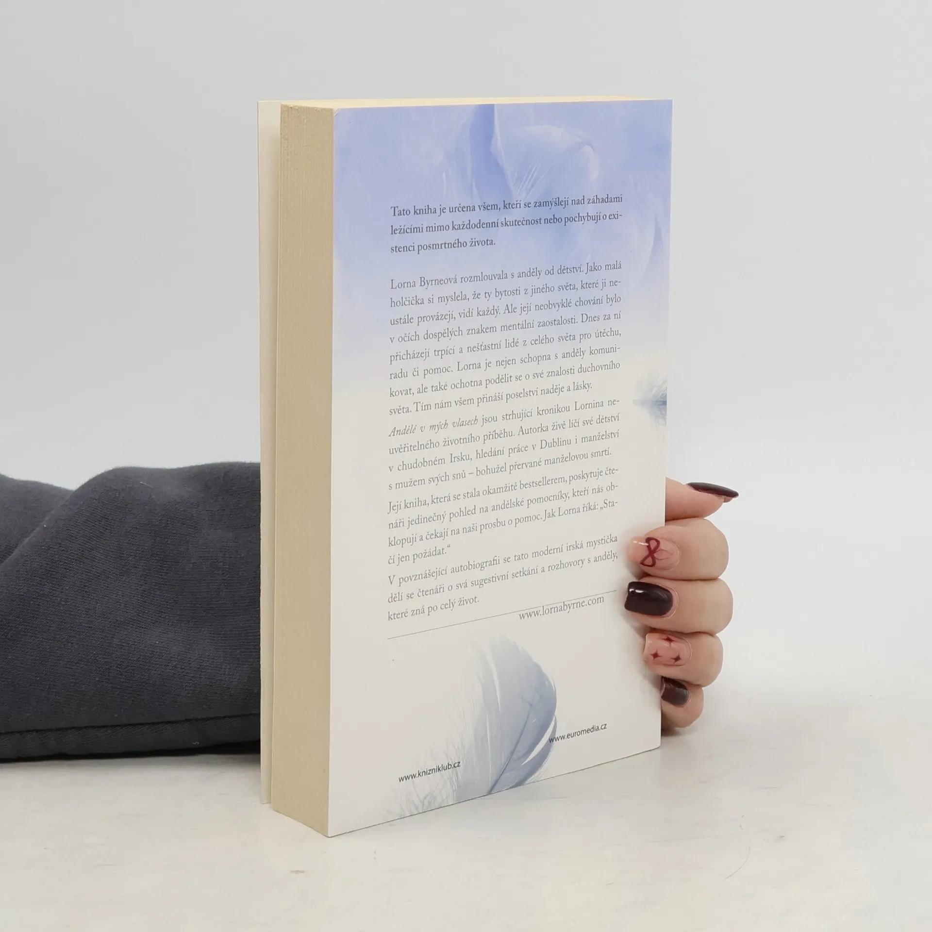 Lorna Byrneová (1953) je irská mystička a autorka mezinárodních bestsellerů. Od dětství má výjimečnou schopnost vidět anděly, po celý život se od nich dozvídá informace, které mohou být pro svět zásadní. Poprvé nyní vychází komplet všech jejích děl, obsahující autobiografickou knihu Andělé v mých vlasech, volné pokračování s názvem Schody do nebe, dále Andělské poselství naděje, v němž autorka radí, jak oslovovat anděly s prosbou o pomoc, a zatím poslední Nebeskou lásku, která je rozšířena o novou kapitolu Láskyplná stezka. Sedm dní, v nichž se naučíte mít víc rádi sami sebe. Čtenáře potěší i 8 andělských karet a pírko.