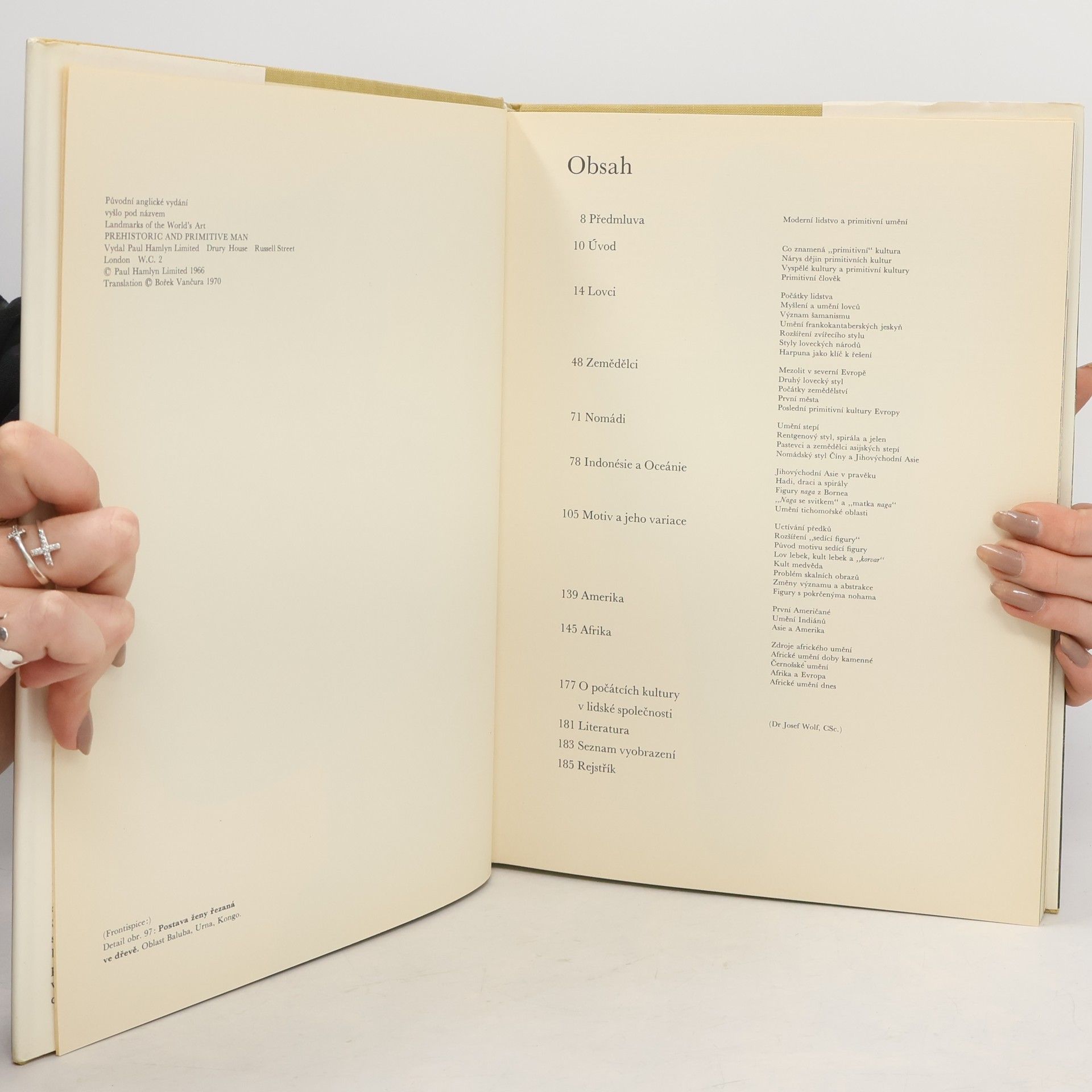 Obrazová publikace seznamuje s uměním pravěkých a přírodních národů. Kniha má 103 barevných a 107 černobílých ilustrací. Doslov napsal Dr. Josef Wolf. Přeloženo z anglické verze "Landmarks of the World's Art: Prehistoric and Primitive Man".