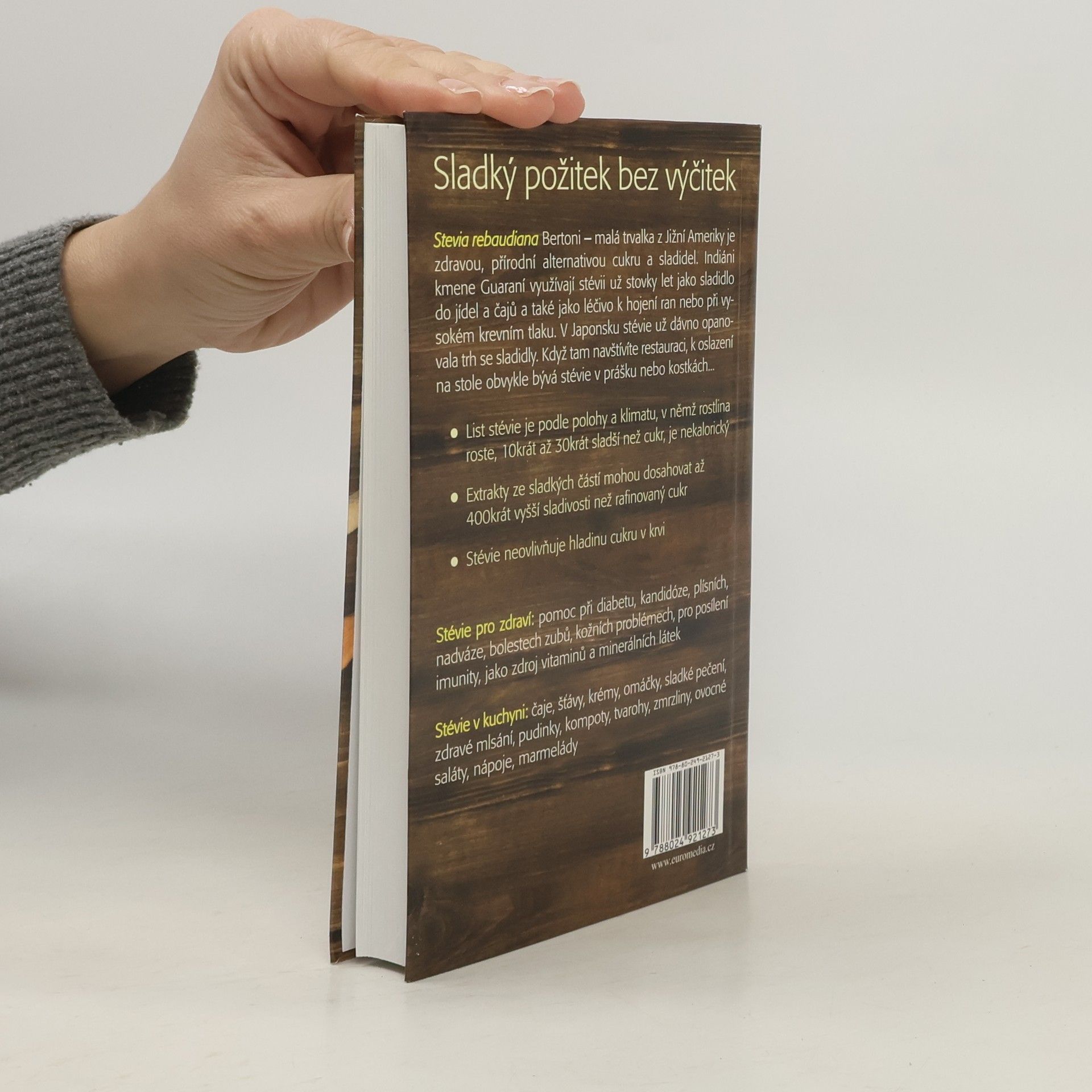 Stévie je sladký požitek bez výčitek, a tím skutečná alternativa cukru a umělých sladidel. Osladí bez kalorií, nemá vedlejší účinky a dodá důležité minerální látky a vitaminy k posílení imunitního systému. Je ideální při nadváze, diabetu, při onemocnění kandidózou a neurodermitidě. Dozvíte se spoustu zajímavého o rostlině stévii, jejím pěstování doma, proč je v Japonsku povolená už dlouho, o produktech se stévií. Můžete sami vyzkoušet řadu receptů a ověřit mnoho cenných rad.