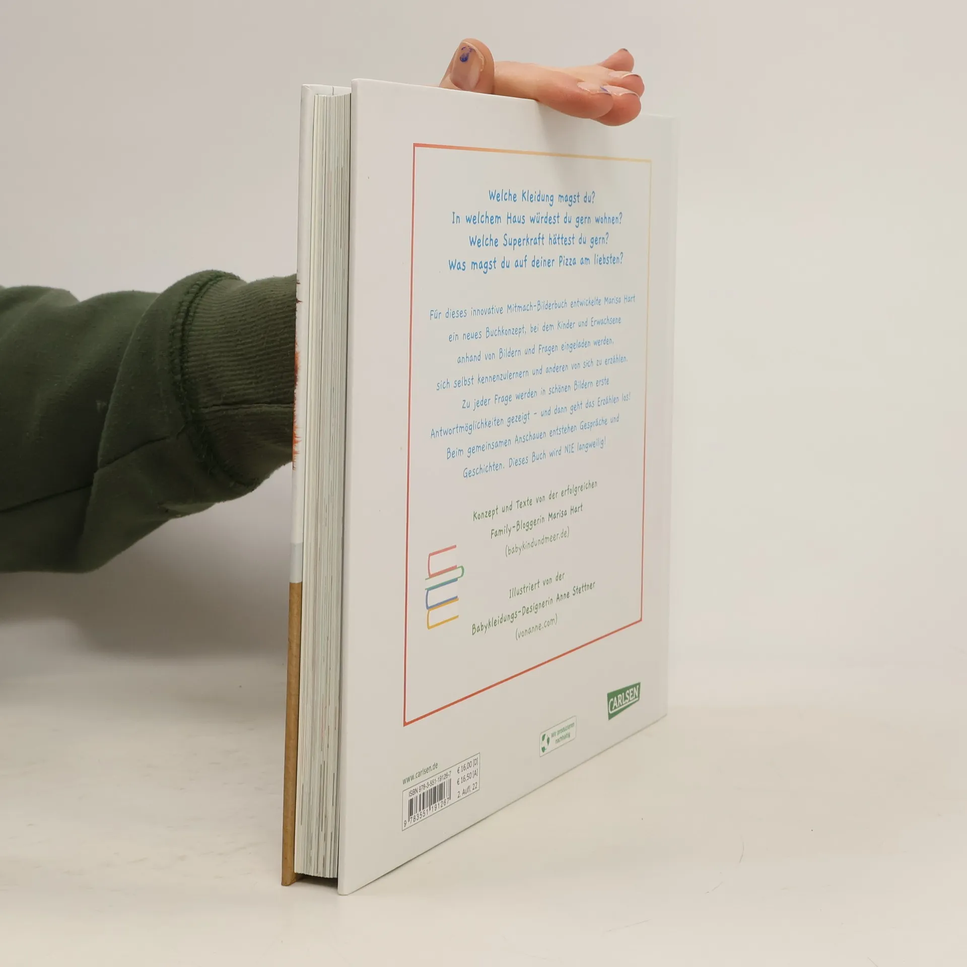 "Welche Kleidung magst du? In welchem Haus würdest du gerne wohnen? Welche Superkraft hättest du gern? Was magst du auf deiner Pizza am liebsten? Für dieses innovative Mitmach-Bilderbuch entwickelte Marisa Hart ein neues Buchkonzept, bei dem Kinder und Erwachsene anhand von Bildern und Fragen eingeladen werden, sich selbst kennenzulernern und anderen von sich zu erzählen. Zu jeder Frage werden in schönen Bildern erste Antwortmöglichkeiten gezeigt - und dann geht das Erzählen los! Beim gemeinsamen Anschauen entstehen Gespräche und Geschichten. Dieses Buch wird NIE langweilig!" --