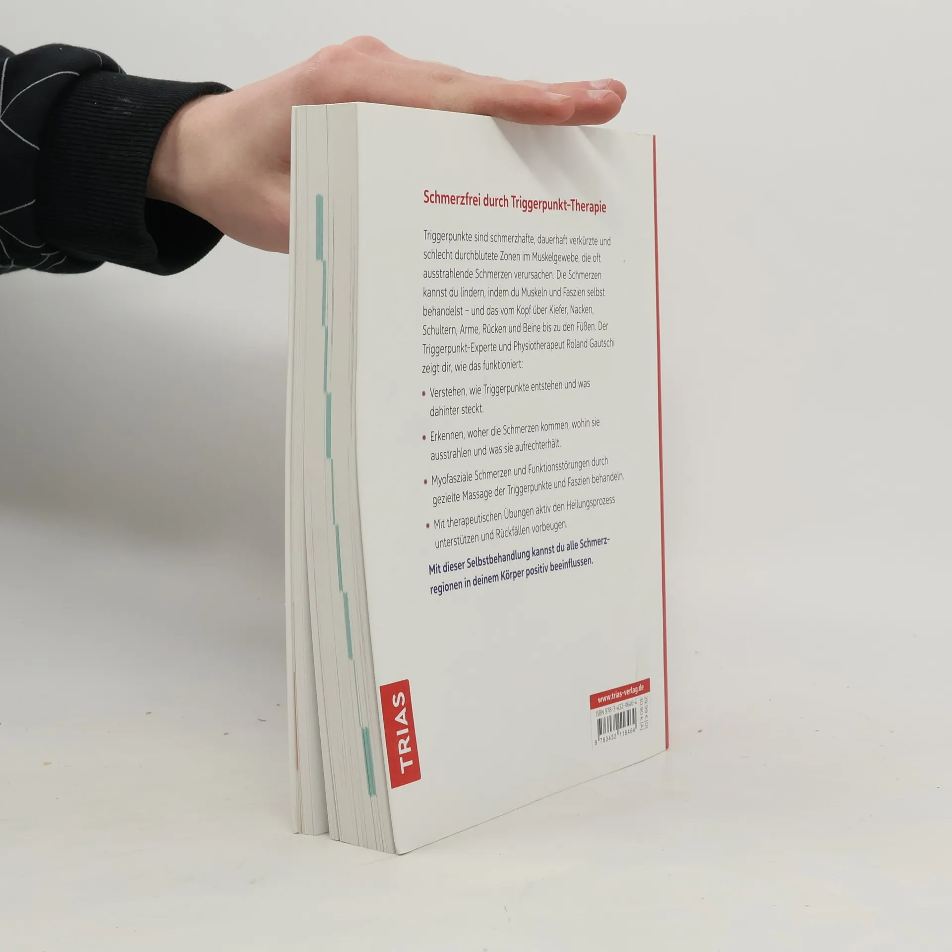 Schmerzfrei durch Triggerpunkt-Therapie Triggerpunkte sind schmerzhafte, dauerhaft verkürzte und schlecht durchblutete Zonen im Muskelgewebe, die oft ausstrahlende Schmerzen verursachen. Die Schmerzen kannst du lindern, indem du Muskeln und Faszien selbst behandelst – und das vom Kopf über Kiefer, Nacken, Schultern, Arme, Rücken und Beine bis zu den Füßen. Der Triggerpunkt-Experte und Physiotherapeut Roland Gautschi zeigt dir, wie das funktioniert: Verstehen, wie Triggerpunkte entstehen und was dahinter steckt, Erkennen, woher die Schmerzen kommen, wohin sie ausstrahlen und was sie aufrechterhält, Myofasziale Schmerzen und Funktionsstörungen durch gezielte Massage der Triggerpunkte und Faszien behandeln, Mit funktionellen Übungen aktiv den Heilungsprozess unterstützen und Rückfällen vorbeugen. Mit dieser Selbstbehandlung kannst du alle Schmerzregionen in deinem Körper positiv beeinflussen.