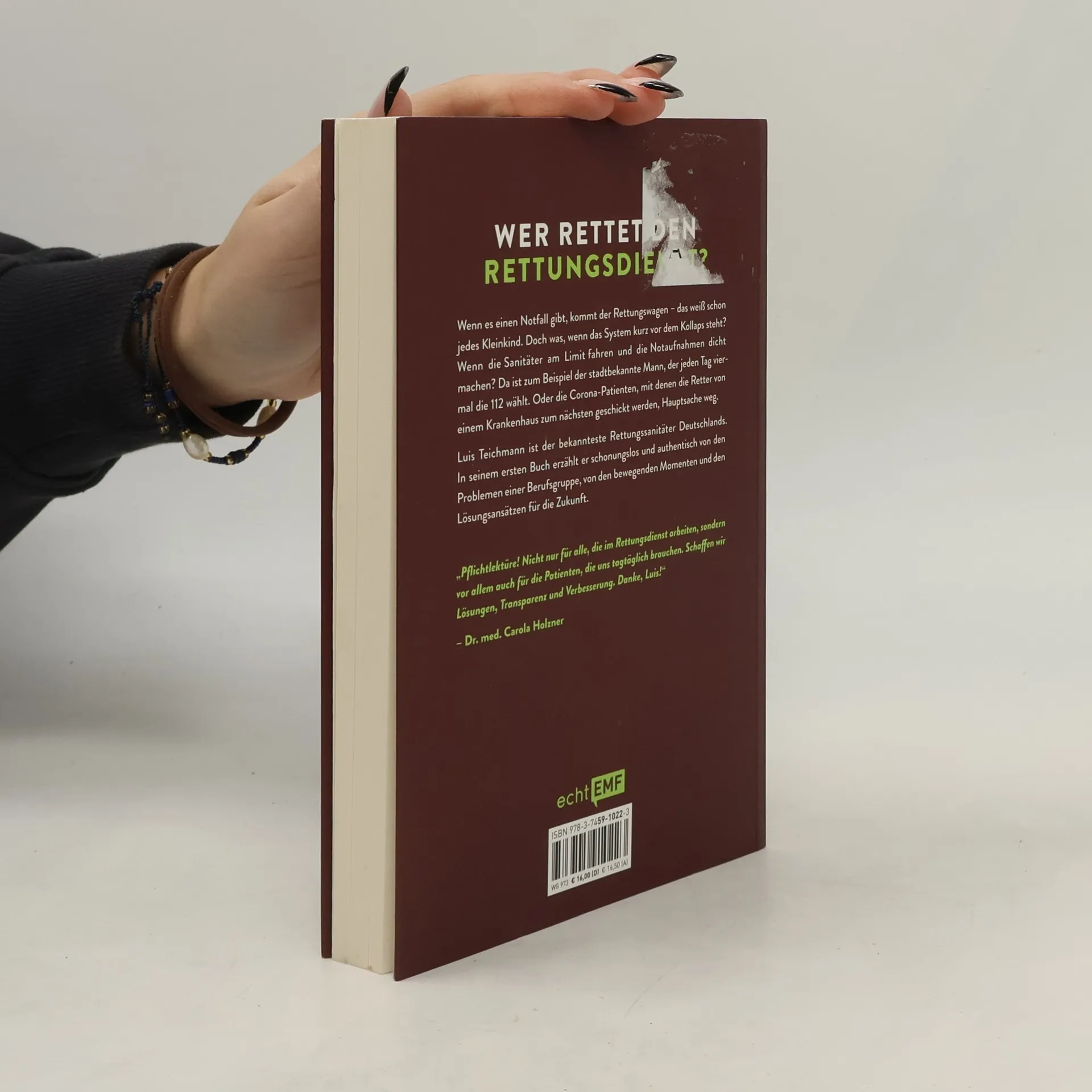 „Ein Taxi ist so teuer und ich zahle doch auch Krankenkassenbeiträge.“ Oder „Wenn Sie mich mitnehmen, komme ich ja schneller dran!“ Solche Sätze hört Luis Teichmann oft. Er fährt seit sieben Jahren im Rettungsdienst und Bagatelleinsätze sind hier nicht die einzige Herausforderung: Nachtschichten, körperlich schwere Arbeit, gewalttätige Übergriffe und die psychische Belastung rücken seinen Job aus der Komfortzone. Da ist zum Beispiel der stadtbekannte Mann, der bis zu viermal am Tag die 112 wählt, an 365 Tagen im Jahr – und jedes einzige Mal muss ein RTW ausrücken. Oder die an Corona Erkrankten, mit denen die Retter*innen von einem Krankenhaus zum nächsten geschickt werden, Hauptsache weg.Wenn es einen Notfall gibt, kommt der Rettungswagen – das weiß schon jedes Kleinkind. Doch was, wenn das System kurz vor dem Kollaps steht? Wenn die Sanitäter*innen am Limit fahren und die Notaufnahmen dicht machen? Luis berichtet auf dem TikTok-Account @5_sprechwunsch aus seinem Alltag, über 800. 000 Follower schauen ihm dabei zu. In seinem ersten Buch erzählt er schonungslos und authentisch von den Problemen einer Berufsgruppe, von den bewegenden Momenten und den Lösungsansätzen für die Zukunft.Denn er und seine Kolleg*innen retten Menschenleben – vielleicht irgendwann auch deins!