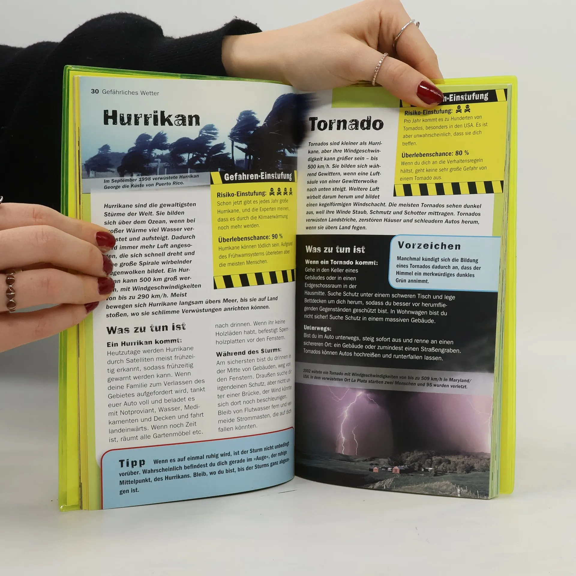 Mit »Die 100 gefährlichsten Dinge« ist nun der ultimativen Überlebensguide für bedrohliche Situationen lieferbar – ob in der Wildnis, auf Reisen oder im alltäglichen Großstadtdschungel. Die Welt ist voller Gefahren. Naturkatastrophen, wilde Tiere und zivilisatorische Alltagsrisiken machen unseren Planeten zu einem wahrhaft gefährlichen Aufenthaltsort. Sandstürme, Hai-Attacken Schlangenbisse und sinkende Schiffe, Vulkanausbrüche - keine Panik, denn hier kommt die Rettung. Dieses Handbuch nimmt jede lebensbedrohliche Situationen mit spektakulären Fotos genau unter die Lupe und bietet wertvolle Tipps und spannende Zusatz-Informationen für den Ernstfall! Wie gefährlich Tornados, Sturzfluten und Killerbienen wirklich sind, verrät jeweils die Risiko-Einstufung. Ab einem Wert von drei Totenköpfen wird‘s richtig brenzlig… Beruhigend: Die Gefahr, es wirklich einmal mit Meteoriteneinschlägen, Kugelblitzen und Fallschirmversagen zu tun zu kriegen, ist ziemlich gering. Erdbeben, Bergnot und angriffslustige Wildschweine können aber durchaus mal vorkommen. Und dann, rette sich, wer kann! Mit diesem Handbuch im Gepäck stehen die Chancen gut… Aus dem Inhalt: Wie verhalte ich mich bei einem Hai-Angriff? Was tun im Falle eines Brückeneinsturzes? Und welcher Trick befreit mich aus einer Lawine?