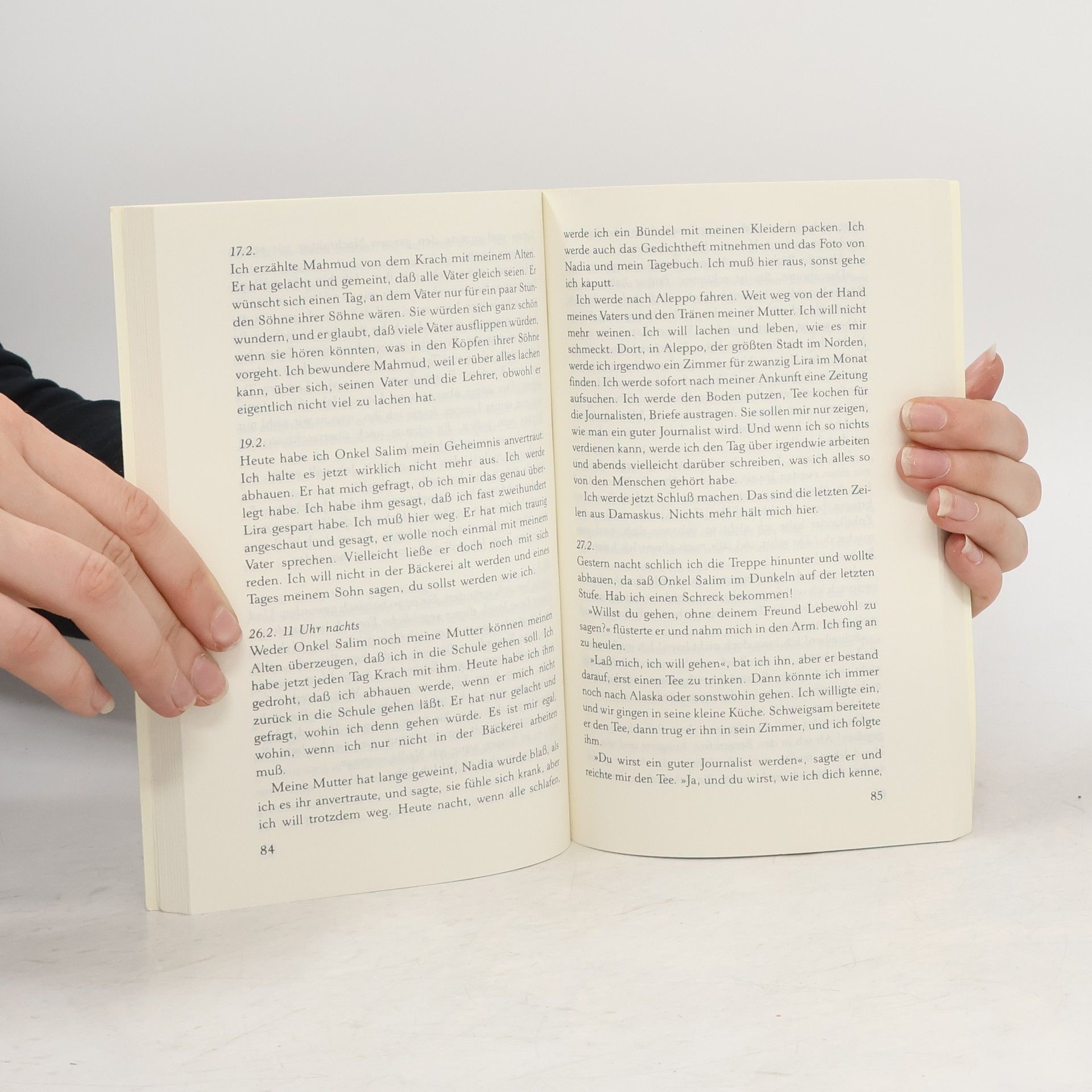 Geschichten aus dem geheimnisvollen Damaskus Über mehrere Jahre hinweg führt ein Bäckerjunge in Damaskus ein Tagebuch. Es gibt viel Schönes, Poetisches und Lustiges zu berichten, aber auch von Armut und Angst erzählt er. Er schildert seinen Vater, den Bäcker, seine Mutter, die Meisterin im Handeln auf dem Basar, seine kleine, pfiffige Schwester Leila. Er erzählt von seinen Freunden und natürlich von Onkel Salim, dem alten Kutscher, der die herrlichsten Geschichten weiß. Eines Tages wird sein Vater bei einer willkürlichen Verhaftungswelle von der Polizei abgeholt und gefoltert. Dies bestärkt den Jungen in seinem Traum, ein Journalist zu werden, der gegen Ungerechtigkeit und politische Verfolgung kämpft.