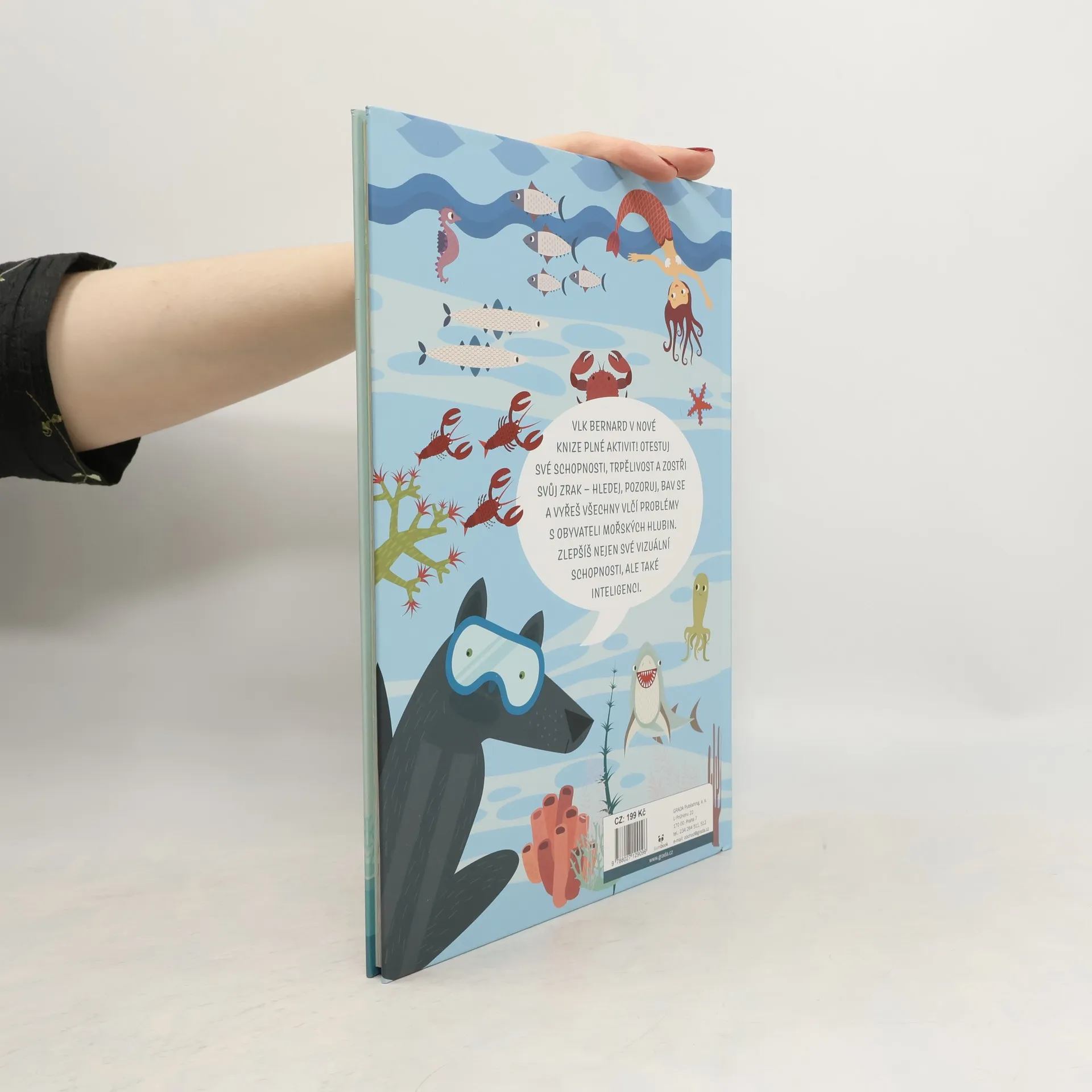 Už jste někdy potkali vlka v brýlích? Ale Bernard je opravdu potřebuje. Kamarád krab mu na dovolené připravuje různé zábavné a pestré pozorovací hry, aby si vlk zlepšil zrak a pozornost. Děti si s knihou užijí spoustu legrace a zároveň budou trénovat svůj postřeh, trpělivost a soustředění.