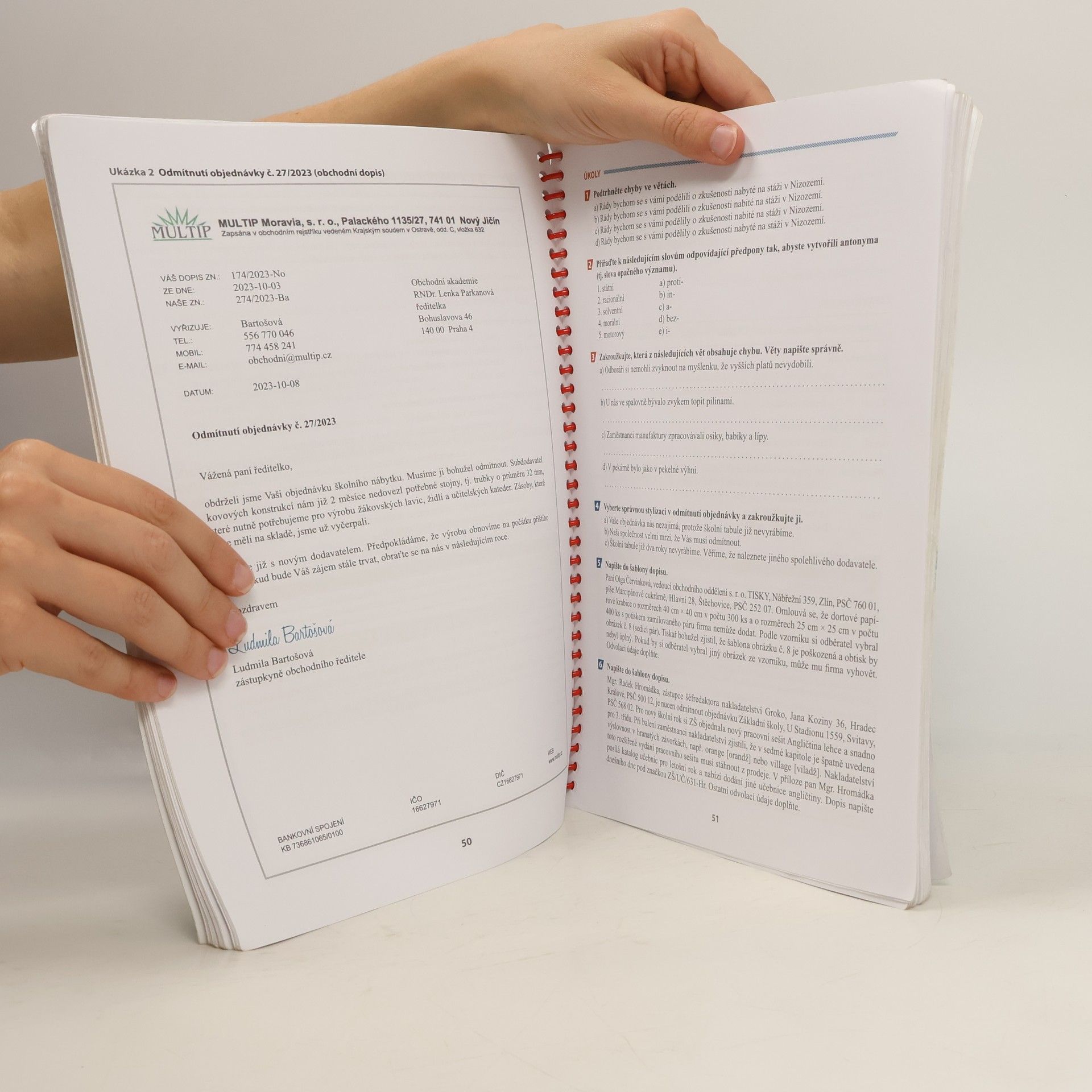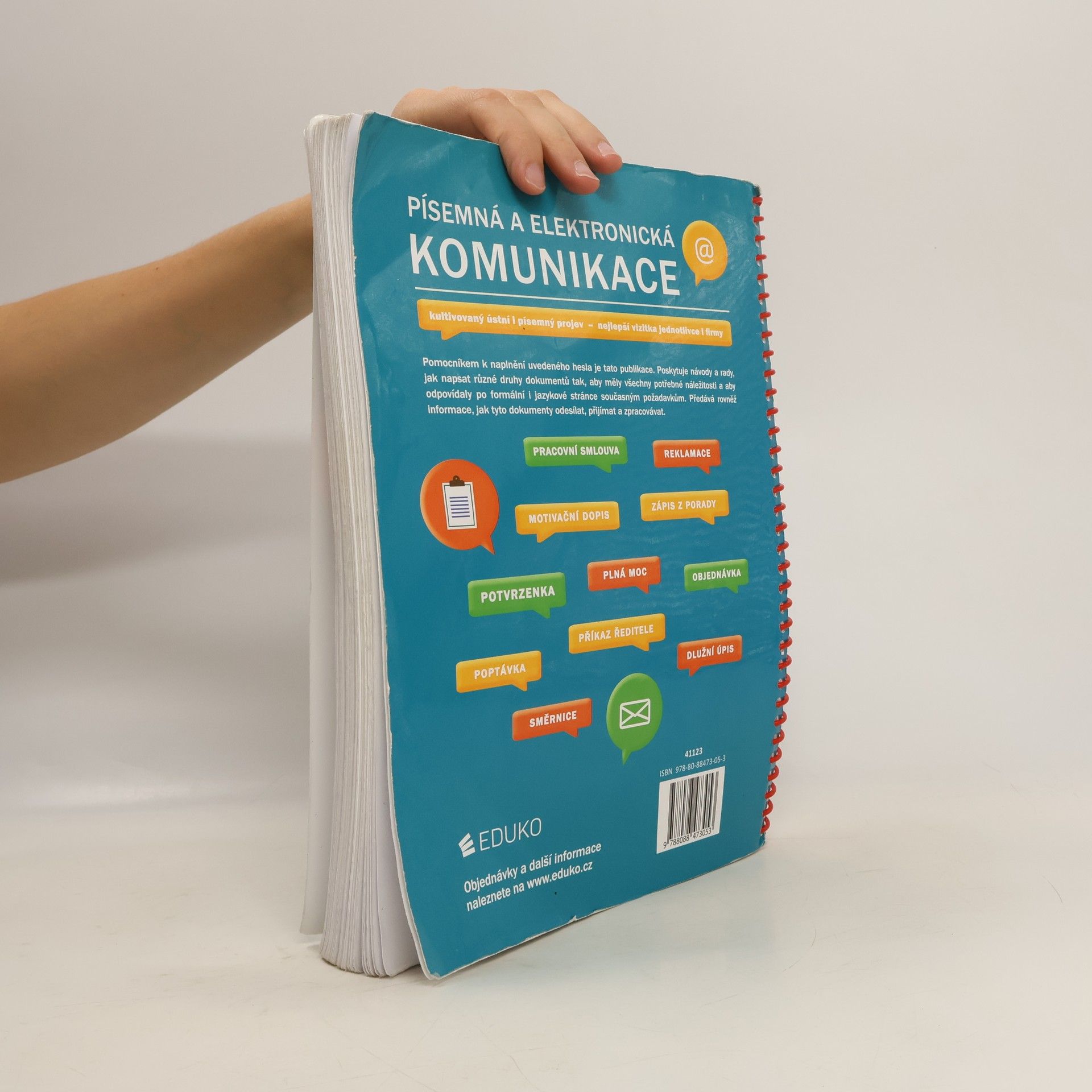 Publikace je určena zejména pro střední školy a jejich studenty. Může však posloužit všem, kteří si chtějí osvojit správné jak formální, tak i obsahové náležitosti různých obchodních, úředních nebo osobních písemností, a to v elektronické i tištěné podobě. Učebnice má udělenu doložku MŠMT pod č. j. MSMT-31989/2016. Ke zvýšení odborné úrovně textu a k zajištění jeho souladu s aktuální ČSN 01 6910 Úprava dokumentů zpracovaných textovými procesory přispěla svými připomínkami PhDr. Markéta Pravdová, Ph.D., MBA, vědecká pracovnice ÚJČ a zpracovatelka nové revize uvedené normy. V učebnici najdete kromě výkladu vzorové ukázky různých dokumentů a úkoly na procvičování. Text je rozdělen do čtyř kapitol: – Úprava dokumentů – Elektronická komunikace – Druhy dokumentů – Práce s dokumentem Ve druhém vydání byly upřesněny některé údaje o psaní značek a znaků, doplněny nejnovější informace o datových schránkách včetně úkolu podporujícího rozvoj digitálních kompetencí žáků, upraven životopis, zaktualizovány časové údaje ve všech písemnostech a provedeny další drobné změny na základě připomínek vyučujících.