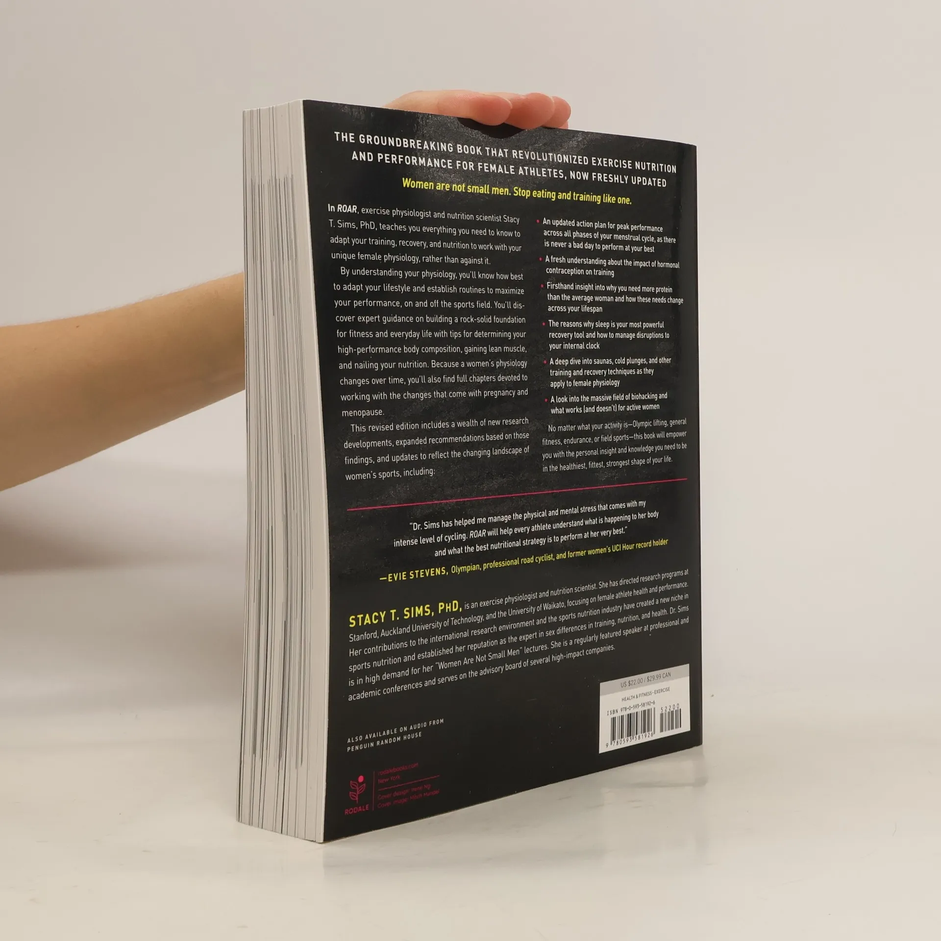 Women are not small men. Stop eating and training like one. Because most nutrition products and training plans are designed for men, it’s no wonder that so many female athletes struggle to reach their full potential. ROAR is a comprehensive, physiology-based nutrition and training guide specifically designed for active women. This book teaches you everything you need to know to adapt your nutrition, hydration, and training to your unique physiology so you can work with, rather than against, your female physiology. Exercise physiologist and nutrition scientist Stacy T. Sims, PhD, shows you how to be your own biohacker to achieve optimum athletic performance. Complete with goal-specific meal plans and nutrient-packed recipes to optimize body composition, ROAR contains personalized nutrition advice for all stages of training and recovery. Customizable meal plans and strengthening exercises come together in a comprehensive plan to build a rock-solid fitness foundation as you build lean muscle where you need it most, strengthen bone, and boost power and endurance. Because women’s physiology changes over time, entire chapters are devoted to staying strong and active through pregnancy and menopause. No matter what your sport is—running, cycling, field sports, triathlons—this book will empower you with the nutrition and fitness knowledge you need to be in the healthiest, fittest, strongest shape of your life.