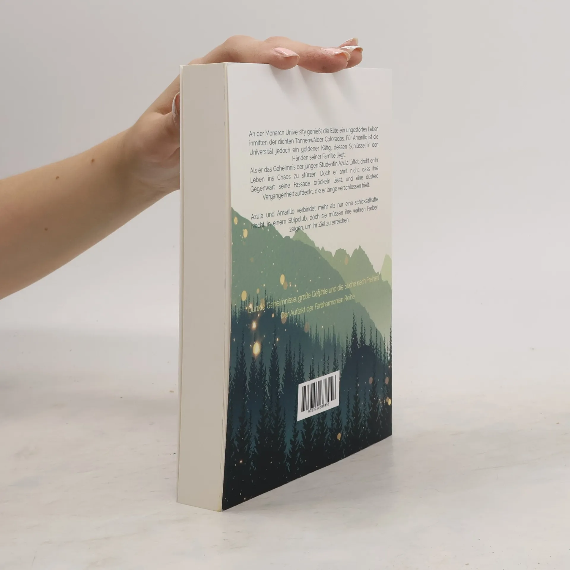 An der Monarch University genießt die Elite ein ungestörtes Leben inmitten der dichten Tannenwälder Colorados. Für Amarillo ist die Universität jedoch ein goldener Käfig, dessen Schlüssel in den Händen seiner Familie liegt. Als er das Geheimnis der jungen Studentin Azula lüftet, droht er ihr Leben ins Chaos zu stürzen. Doch er ahnt nicht, dass ihre Gegenwart seine Fassade bröckeln lässt, und eine düstere Vergangenheit aufdeckt, die er lange verschlossen hielt. Azula und Amarillo verbindet mehr als nur eine schicksalhafte Nacht in einem Stripclub, doch sie müssen ihre wahren Farben zeigen, um ihr Ziel zu erreichen. Dunkle Geheimnisse, große Gefühle und die Suche nach Freiheit. Der Auftakt der Farbharmonien Reihe. »Düster, romantisch und mysteriös. True Colors hat mich in einen Bann gezogen, der mich so schnell nicht mehr loslassen wird.« - ma.rieee__books