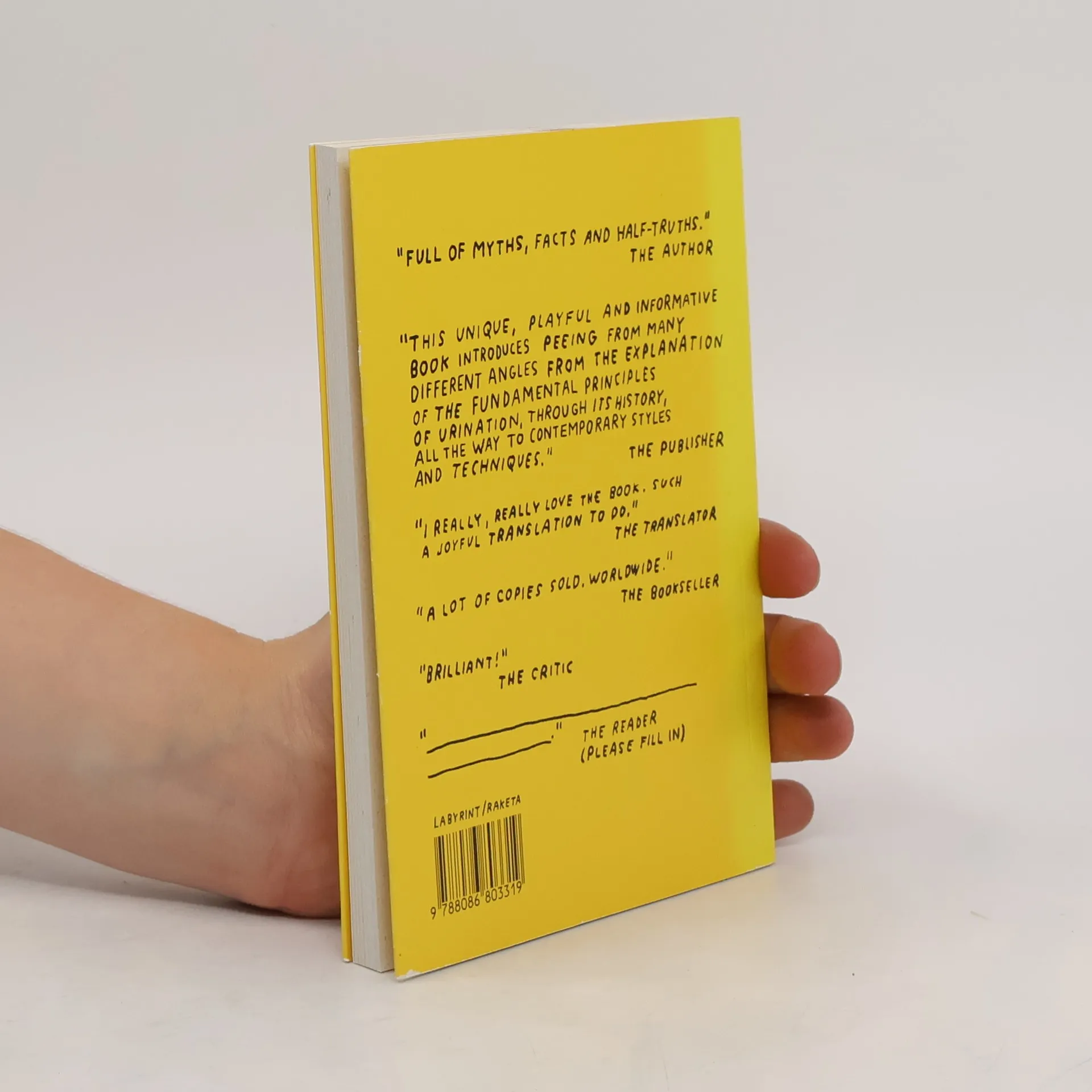 "Full of myths, facts and half-truths." - The Author. "This unique, playful and informative book introduces peeing from many different angles from the explanation of the fundamental principles of urination, through it's history, all the way to contemporary styles and techniques." - The Publisher. "I really, really love the book. Such a joyful translation to do." - The Translator. "A lot of copies sold, wordwide." - The Bookseller. "Brilliant!" - The Critic.